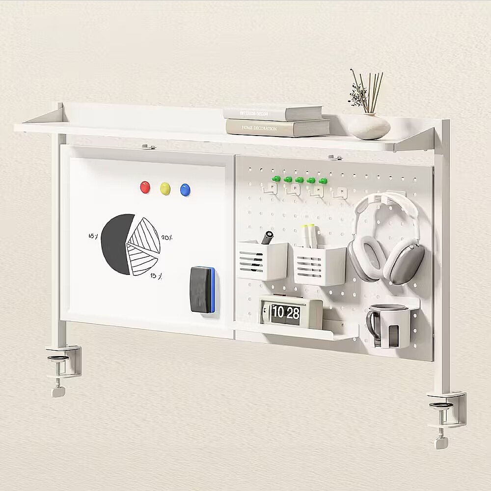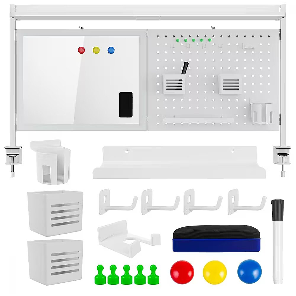 Description - The ER-301 multifunctional desk extension is a compact and extremely practical solution for people who want to organize their workspace and have all the necessary accessories at their fingertips. The design attaches to the tabletop with sturdy metal clamps to ensure stability without the need for drilling. A narrow top shelf running the full width of the extension is ideal for small items such as notes, decorations or an office organizer. The centerpiece of the ER-301 extension is a magnetic dry-erase board on which you can conveniently write notes with a marker (included) and wipe them off with a sponge. Next to it is a perforated metal board that allows free arrangement of accessories. Among others, it comes with four hooks, two pen containers, a cup holder, a shelf, as well as a set of 5 magnetic pins and 3 magnets, giving you full organizational freedom. All this makes the ER-301 extension desk not only an aesthetically pleasing addition to the desk, but also an extremely practical organizational tool that increases the efficiency of work and improves the comfort of daily use.