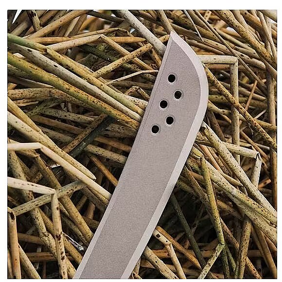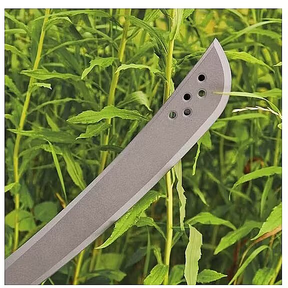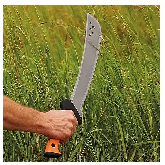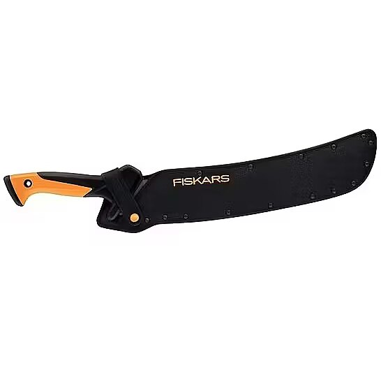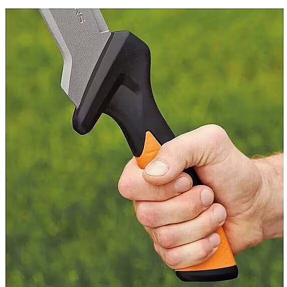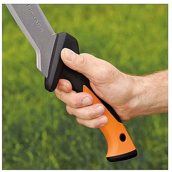 The 38 cm blade is ideal for thinning thick shrubs and cutting roots, branches, and other debris in the yard and garden. The long, curved blade prevents the machete from getting stuck in dense shrubs. Easy one-handed operation allows you to pick up debris with the other, eliminating the need for two hands. Hardened steel stays sharp longer. The corrosion-resistant, low-friction coating doesn't stick to cutting surfaces. The intelligent handle texture features large grooves for finger rest and smaller grooves for full-hand comfort and blister prevention. The contoured handle with a soft-grip coating fits naturally in the hand. The flared handle tip provides a firm grip even when swinging with maximum force. The extended handle allows you to grip right at the base for added precision. The handle has enough room for both hands if you need extra strength and control. The finger guard enhances safety. Nylon protector included.