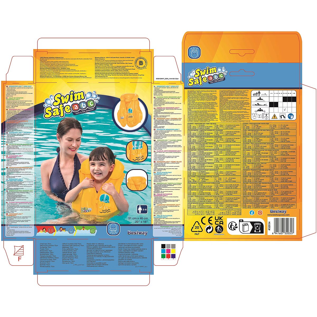 LongSummaryDescription - Bestway Swim Safe ABC WonderSplash Inflatable Toddler Swim Vest. Product colour: Blue, Yellow, Product type: Swim vest, Target audience: Child. Width: 460 mm, Depth: 510 mm, Weight: 247 g. Package width: 140 mm, Package depth: 40 mm, Package height: 215 mm. Products per shipping (inner) case: 24 pc(s), Master (outer) case width: 290 mm, Master (outer) case length: 400 mm