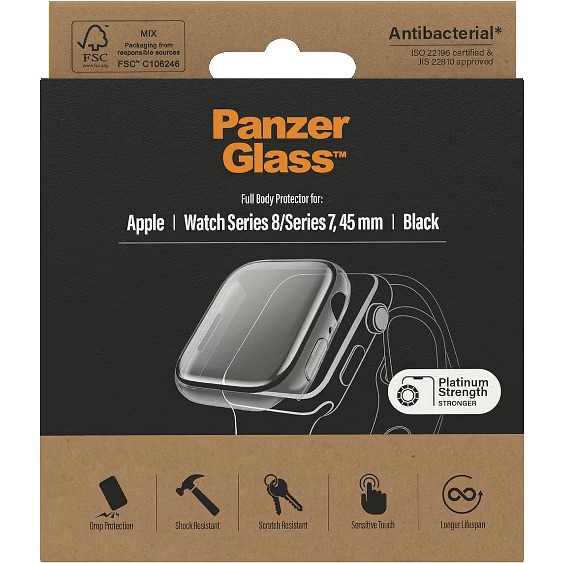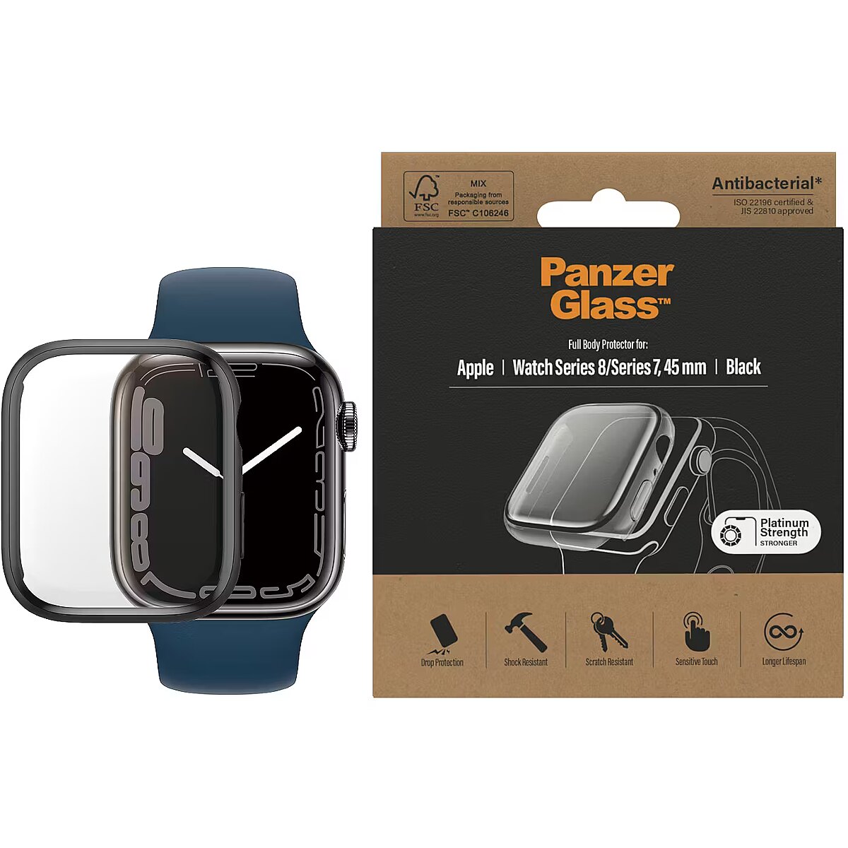 LongSummaryDescription - PanzerGlass ® Screen Protection Full Body Apple Watch Series 9 | 8 | 7 | 45mm | Black. Brand compatibility: Apple, Compatibility: Apple - Watch Series 7 45mm, Apple - Watch Series 8 45mm. Dry application. Protection features: Scratch resistant, Shock resistant, Anti-bacterial. Material: Tempered glass, Polyethylene terephthalate (PET), Product colour: Black. Quantity per pack: 1 pc(s)