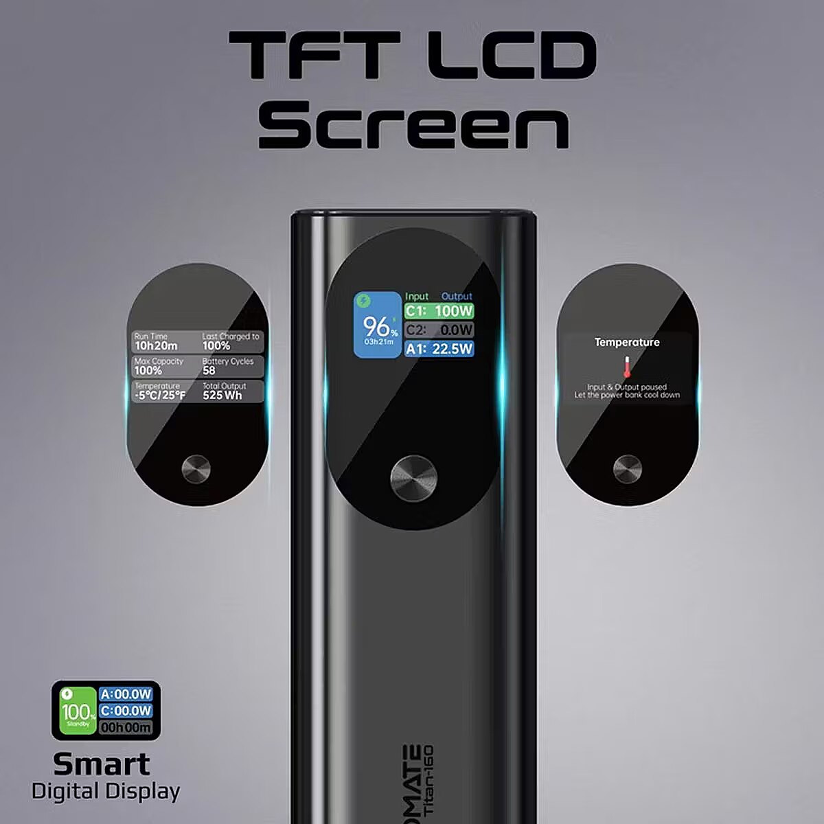 description_en - Titan-160 from Promate - a 160W power bank with support for Power Delivery 3.1 and Quick Charge 3.0 will easily charge all your devices. And the metal case and LCD display will add reliability and practicality in everyday use.