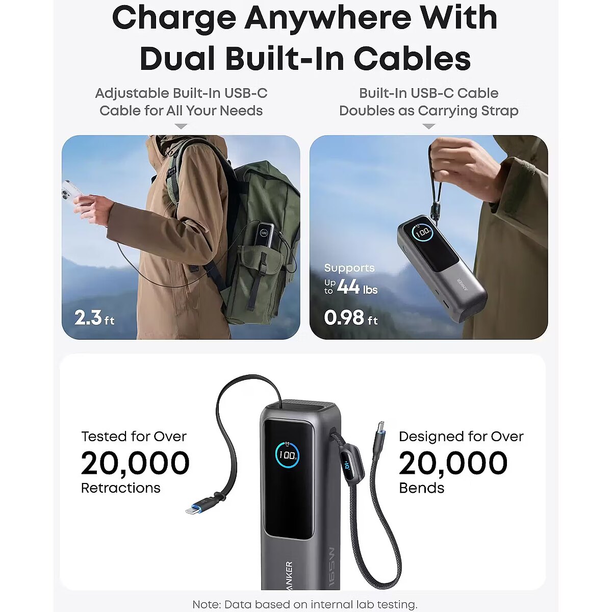 LongDesc - Anker Power Bank 25000mAh 165W Ultra-Fast Portable Charger with Built-In and Retractable USB C Cables A1695