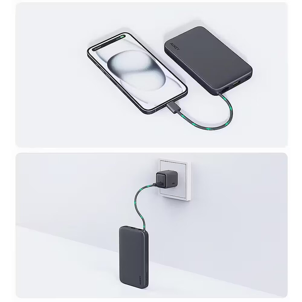 Kirjeldus - Power bank AUKEY PB-Y53P Spark Sling 10000mAh Lite Plus 22,5W + sisseehitatud kaabel AUKEY Power Delivery USB-C - USB-C + kaabel AUKEY Power Delivery USB-C - USB-C Võimalus laadida 3 seadet korraga KIIRLAADIMINE KUNI 20 W: Kiire laadimine ja täiendamine 20 W SISSEEHITATUD USB-C KAABEL: Mugavus ja õhuke disain MITME SEADME LAADIMINE: 3 seadme samaaegne laadimine MITMEKORDNE KAITSE TEHNOLOOGIA: Uusim tehnoloogia, mis kaitseb seadet ülepinge, ülekuumenemise ja lühise eest LAIA ULATUSEGA ÜHILDUvus ENAMIKU SEADMETEGA, MILLEL ON USB-C PISTIK: nagu Android, iPhone 15 ja uuemad, Apple tooted, Nitendo Switch jne. REISISÕBRALIK: Kõikide lennufirmade poolt heaks kiidetud sertifikaatidega terviklik kaitse