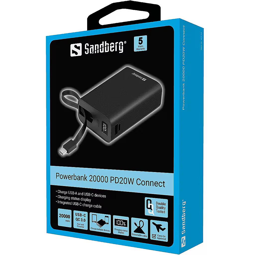 LongDesc - Sandberg Powerbank 20000 PD20W Connect is a powerful yet compact high-capacity powerbank. Perfect for charging your smartphone and tablet when you're away from the mains. Supports both USB-A and USB-C PD 20W. With its integrated USB-C charging cable, you won't need to bring a separate charging cable along.