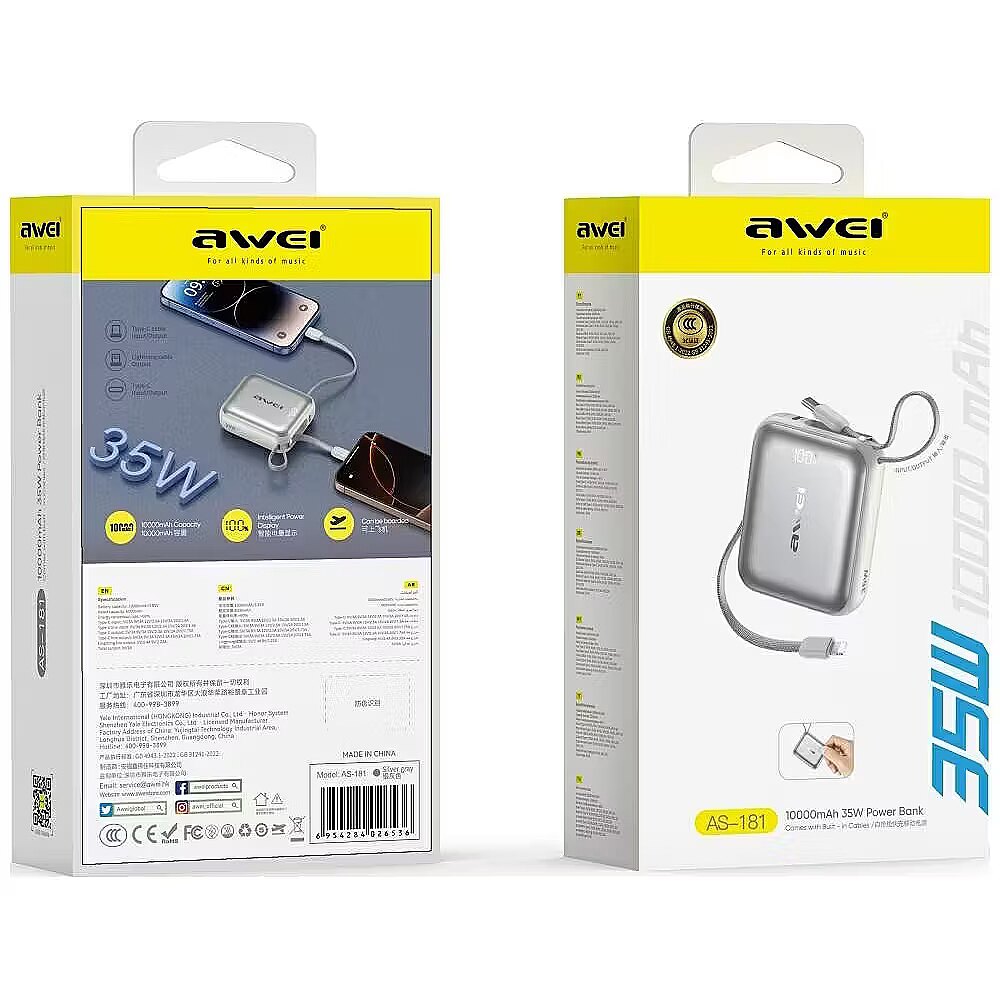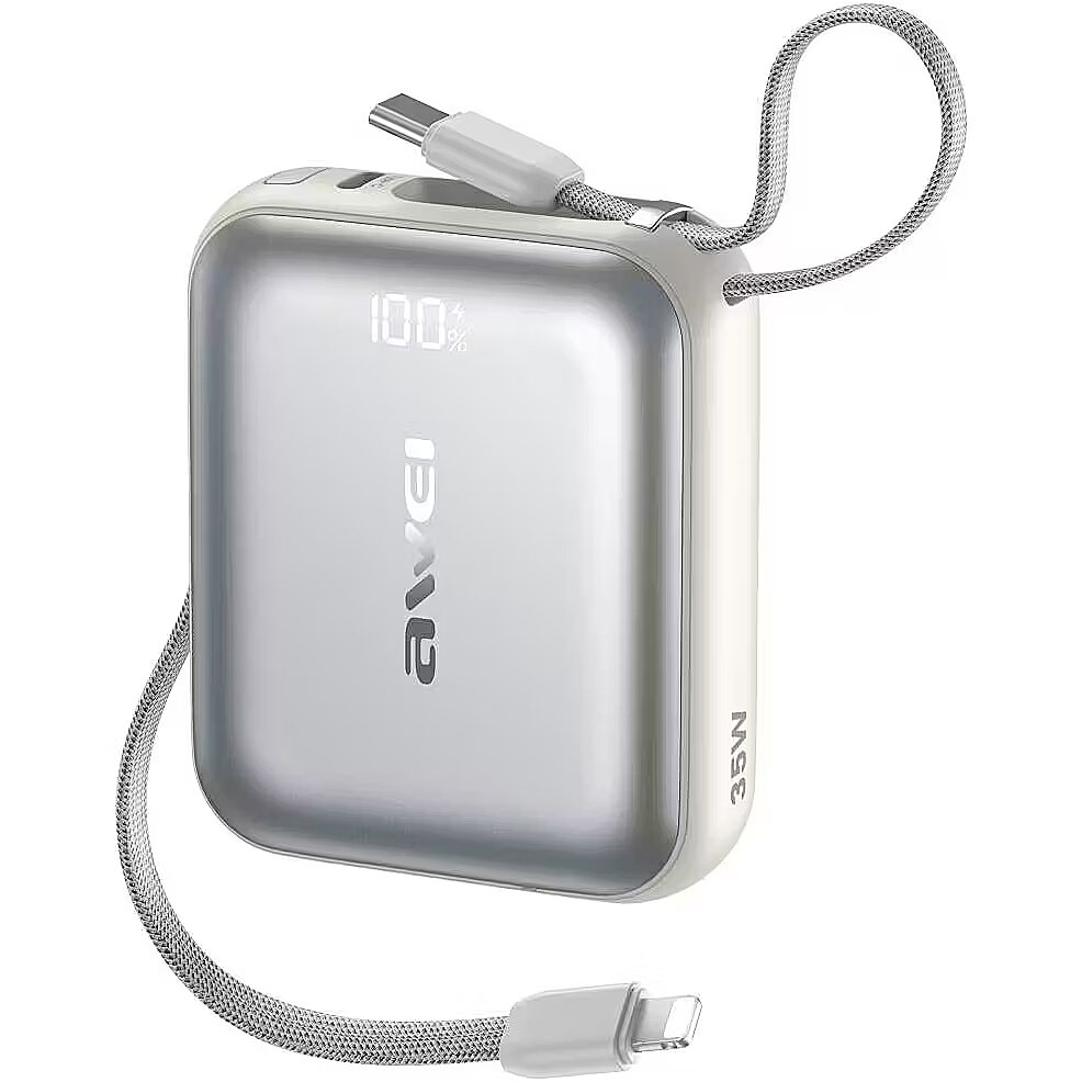 Description - Powerbank Awei AS-181 10000mAh 35W USB-C + Lightning/USB-C cables silver Powerbank AWEI with a capacity of 10 000 mAh is a modern and extremely convenient source of energy, created for users who value mobility. The device is equipped with double, built-in wires, which at the same time act as a charging cable and a practical leash. Thanks to this, you do not need to carry any additional cables with you, and the powerbank can be easily attached to the bag or carried on the wrist. The polymer battery used ensures high efficiency and stability of operation, and numerous protections protect against overcharging, overheating and short circuit. Powerbank supports fast charging with a power of up to 35 W, thanks to which it significantly reduces the time of replenishment of energy in modern smartphones and other mobile devices. In practice, this allows you to charge the iPhone 14 Pro to 60%, the Xiaomi 13 Pro to 40%, and the Samsung S23 to 25% in a short time. The digital LED display placed on the housing shows the current energy level, which makes it easier to control the remaining capacity. Powerbank offers three popular interfaces, allowing you to simultaneously charge several devices and guarantee wide compatibility with various models of phones, tablets and accessories. AWEI 10 000 mAh is a sleek, functional and versatile powerbank for people who need a reliable energy source on the go, at work or during daily activities.