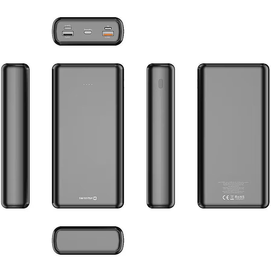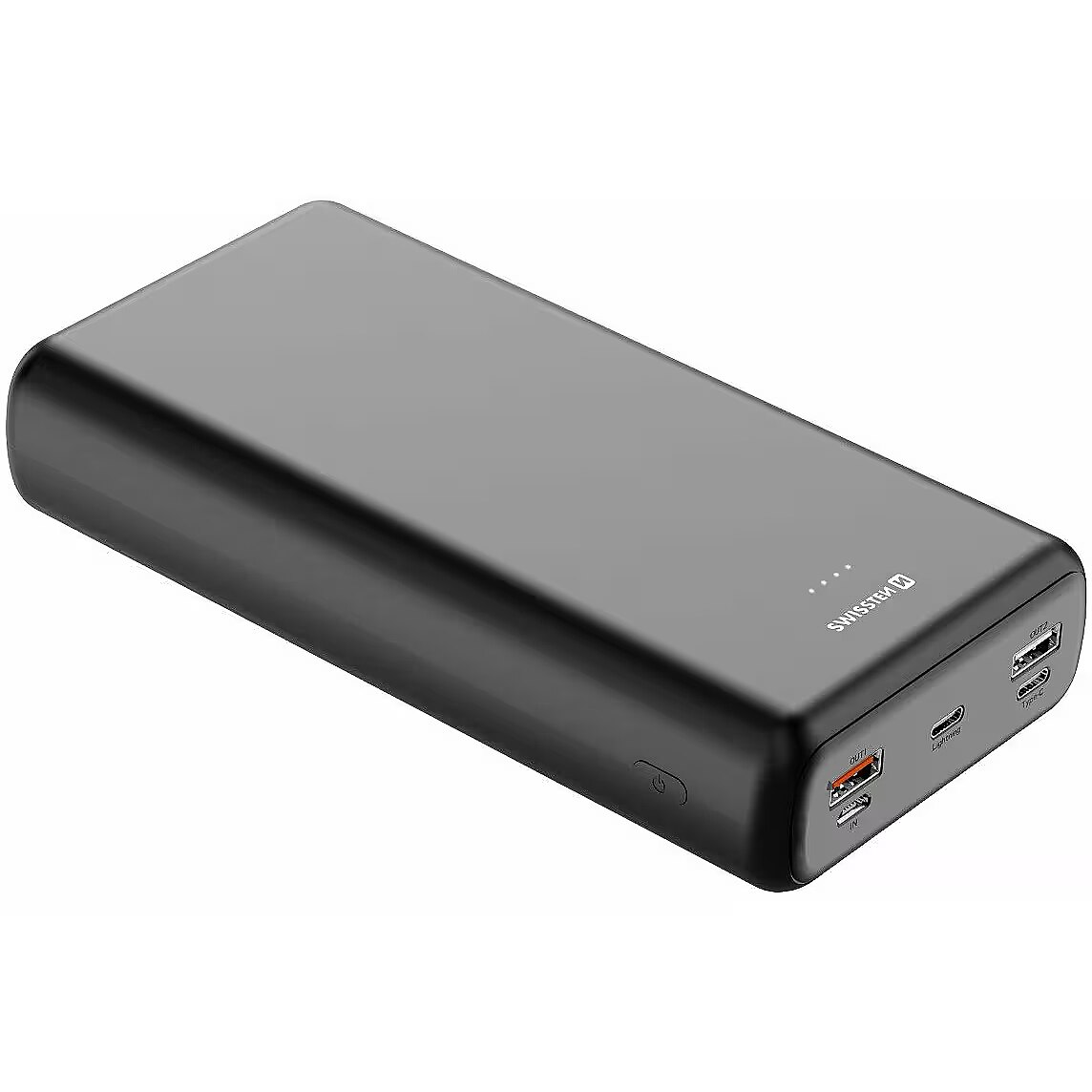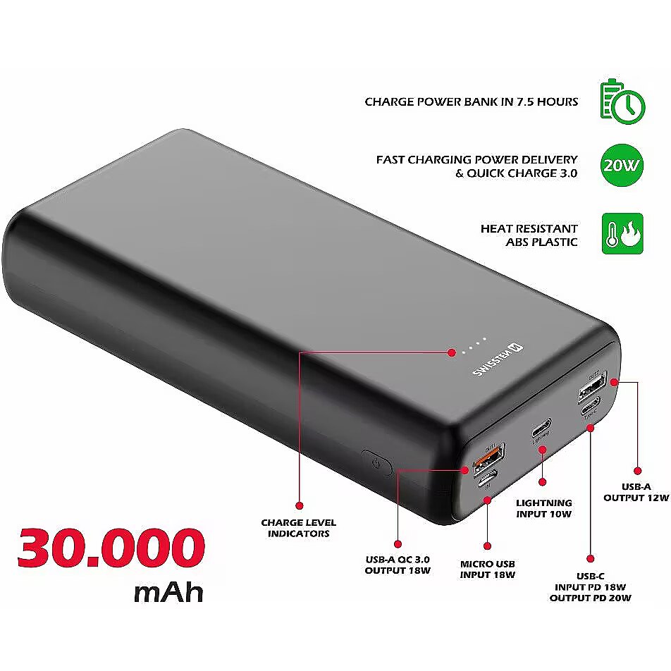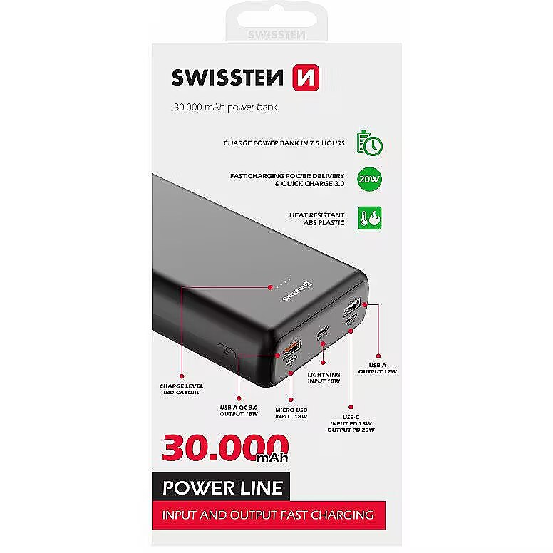 description_en - SWISSTEN Powerbank with 30,000 mAh capacity with microUSB, USB-C and lightning inputs and 2xUSB-A, USB-C outputs and PD and QC fast charging.