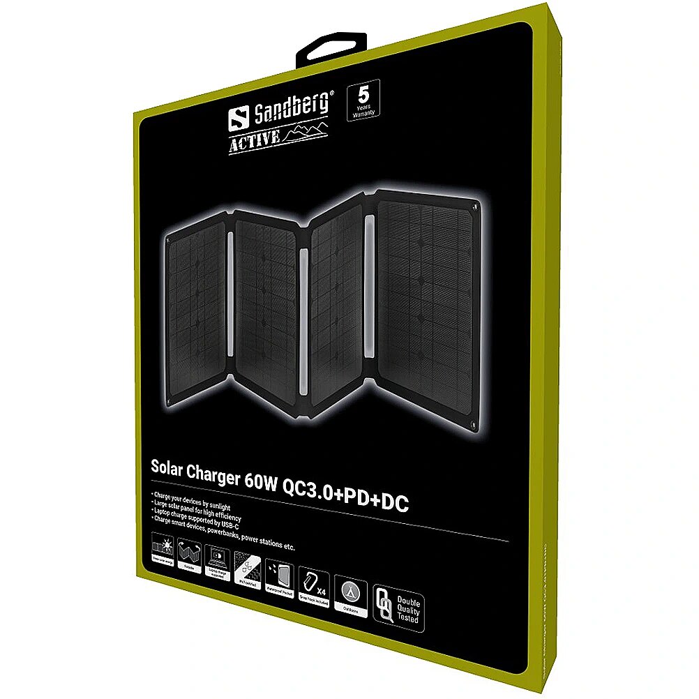 LongSummaryDescription - Sandberg Solar Charger 60W QC3.0+PD+DC. Rated power: 60 W. Solar cell type: Monocrystalline silicon, Product colour: Black, USB connector type: USB Type-A, USB Type-C. Package width: 310 mm, Package depth: 70 mm, Package height: 380 mm. Weight: 2.2 kg, Folded width: 29.9 cm, Folded height: 36.7 cm
