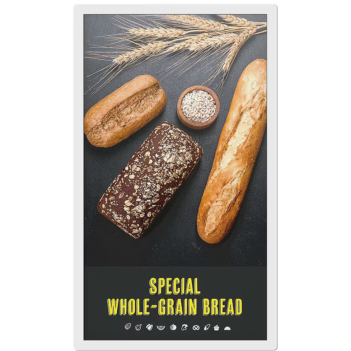LongDesc - Sharp ePaper Displays - groundbreaking advance in energy-efficient signage technologyA groundbreaking advance in energy-efficient signage technology, the ePaper Display consumes a remarkable zero watts when presenting content. Taking only minimal power draw when content changes, innovation in ePaper signage is making a significant step forward toward the carbon-neutral era.A digital alternative to paper posters, full colour ePaper presents static content that’s always on display, but might need regular updating, such as POS promotions, menu boards and allergen information in retail and hospitality locations, or timetables, check-in, and gate information in transportation settings. Visible in bright environments, with a paper-like appearance that’s easy on the eyes with no reflections nor blue light, ePaper is signposting for sustainability and viewer comfort. An integrated SoC secures smart and future proof operation, driving content via selected CMS partners, or enjoy the simplest content management using USB, Wifi or Bluetooth.The ultra-light weight ePaper display can be hung like a picture frame or free standing in any orientation. Capable of being powered by battery with no need for a power cable, it demands little in the way of installation and even less during operation.