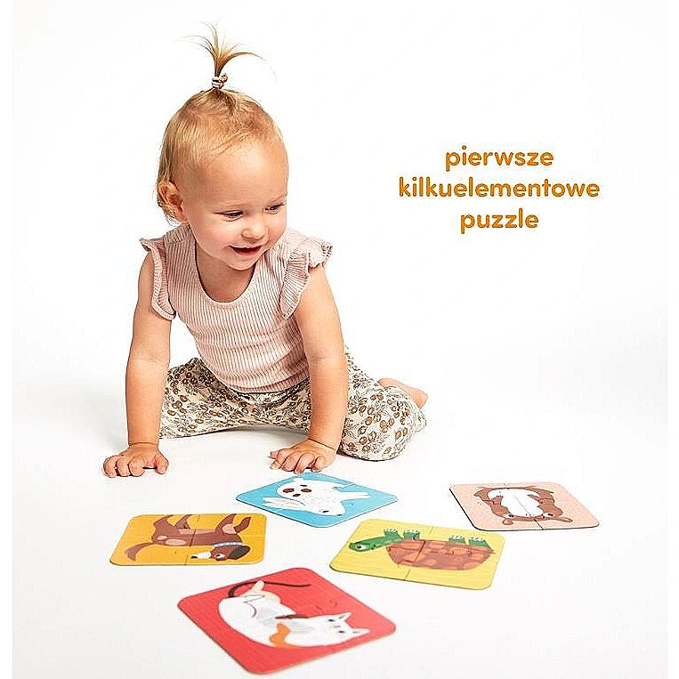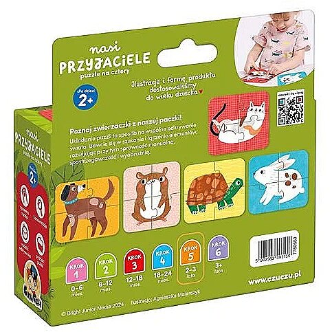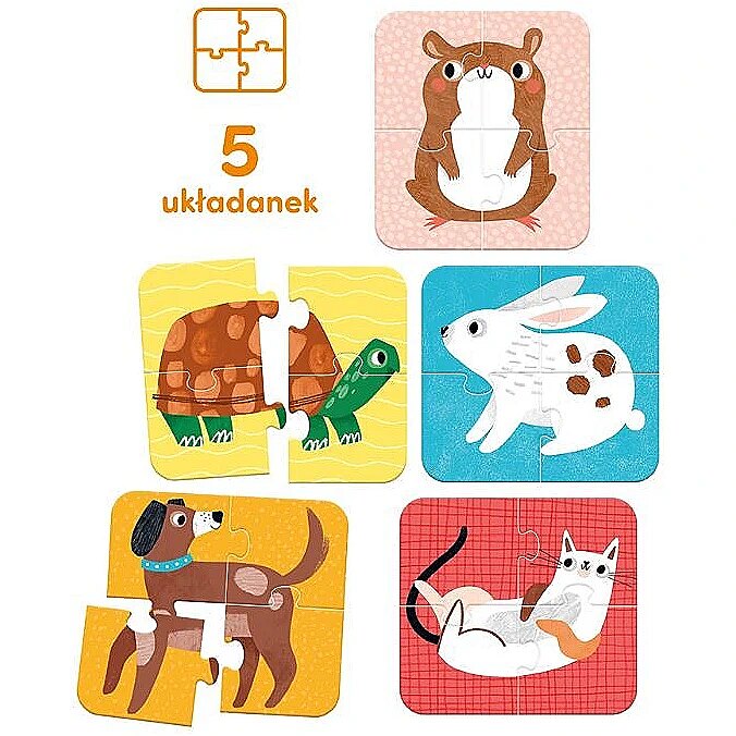 Description - Hey, little ones! Play with us, the furry friends! Can you recognize all the animals in the illustration? Puzzles for Four - Our Friends is an educational set in a handy little box. Inside, you'll find 5 four-piece puzzles featuring beloved domestic animals: a cat, a dog, a hamster, a turtle, and a bunny. Have fun with them in many ways: Assemble the Puzzles Searching for matching puzzle pieces enhances observation skills. To make it a bit easier, the puzzles have backgrounds in different colors. Connecting the pieces is a great exercise for fine motor skills. You can start by playing with fewer puzzles to keep it simple. Funny Sounds What sounds do the animals make? Have fun mimicking funny noises: bark, meow, or purr. This isnt just a way to trigger lots of laughter but also a great speech exercise. Movement is Health! How do the animals move? Who jumps, runs fast, or walks veeeery sloooowly? Imitate their movements! Its excellent exercise for your body! New Words Name the animals as well as the colors, body parts, and other details in the illustrations. Riddles Ask your child different questions. Who has a shell? Who loves munching on carrots? Who do we call a purrer? The little one can answer or point to the answers with their finger. What is it? You can also use the illustrations to learn another language. Let the fun begin!