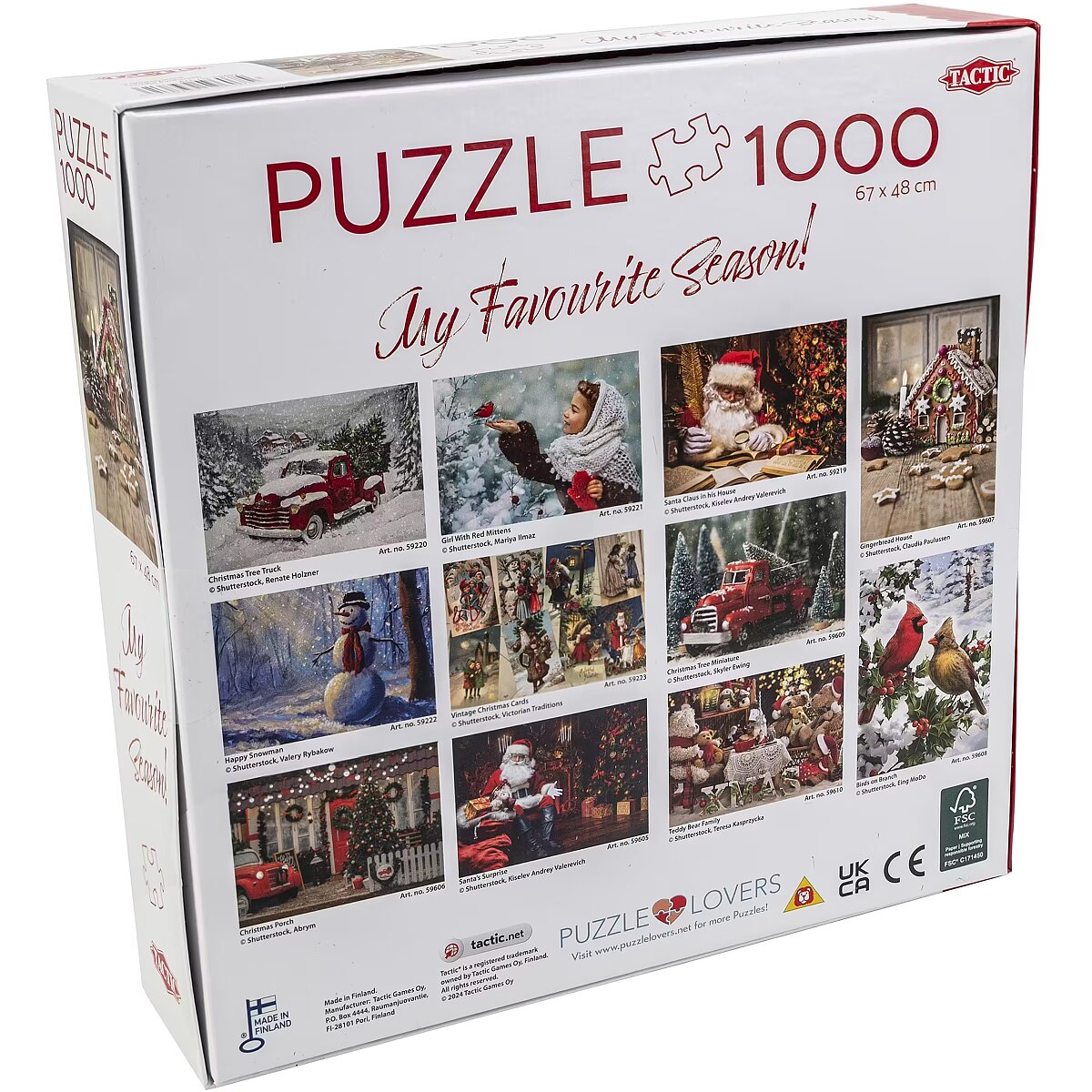 LongDesc - Puzzle Lovers 1000 is a range of fun puzzles for both eager beginners and true puzzle lovers. Each puzzle consists of 1000 high-quality pieces.This product is made in Finland, at Tactic Games' own responsible factory. Our own production ensures the traceability of all materials, and we were awarded the FSC certificate in 2021. We also monitor our carbon footprint closely.