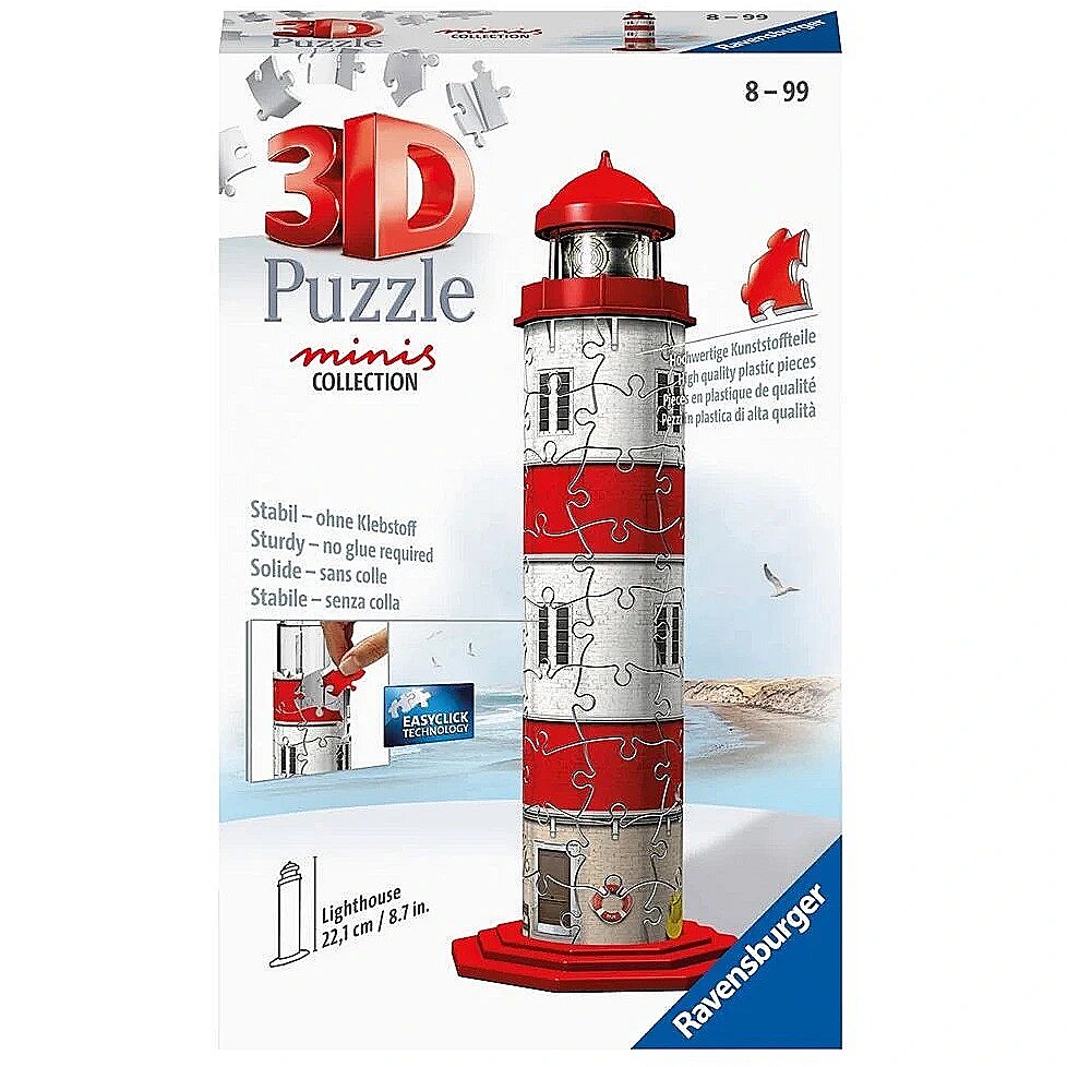 Description - Puzzle 54 pieces 3D Mini Lighthouse Create unique 3D constructions with 3D puzzles from Ravensburger! Discover a new, three-dimensional way of putting the puzzles together their pieces are made of rigid plastic that allows the constructions to hold together without the use of glue. The stacked objects do not delaminate and the puzzles stick firmly to each other. A number is printed on the inside of each puzzle so that the ball is assembled according to the order of the pieces. The material used for the blocks is easy to clean, just use a damp cloth. The Minis Collection 3D Lighthouse Puzzle is an unusual product for lovers of architecture in a mini version, combining the possibility of playing with spatial puzzles and creating a decorative element of the room. The unique 3D construction collection in puzzle version is sure to delight any child, teenager or collector. This unique model features faithfully reproduced details and execution to scale with the real building. Ravensburger jigsaw puzzles allow the acquisition of valuable skills using the learning through play function. The construction from 3D puzzles combines the pleasant with the useful - it develops spatial imagination, improves concentration, teaches perceptiveness and patience, and when assembled, it can serve as a striking room decoration. It is also a great activity for big and small and an opportunity to spend time together.