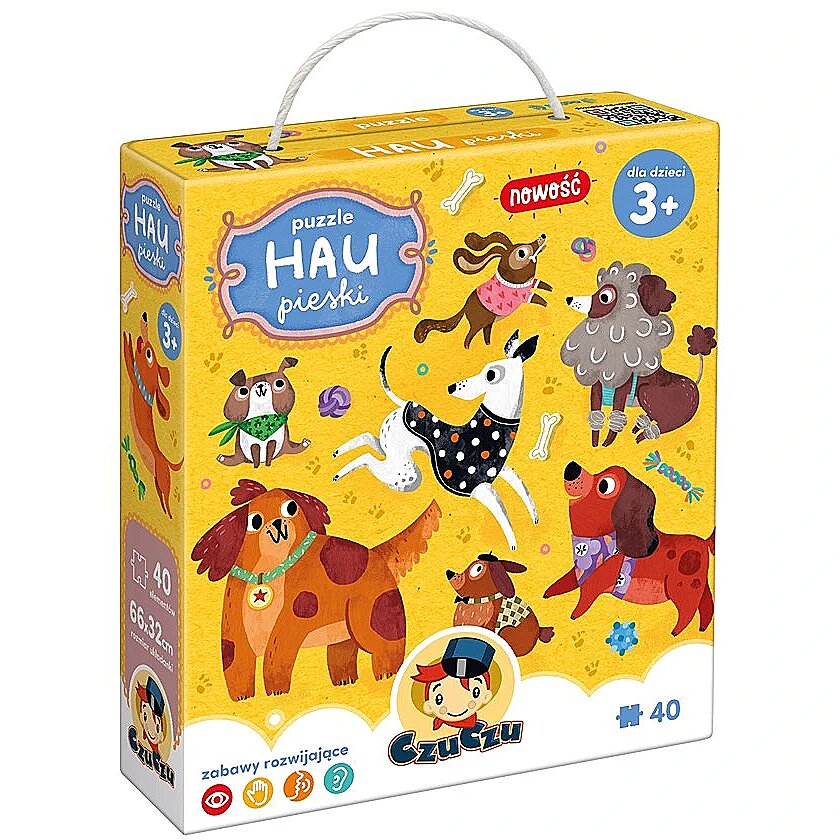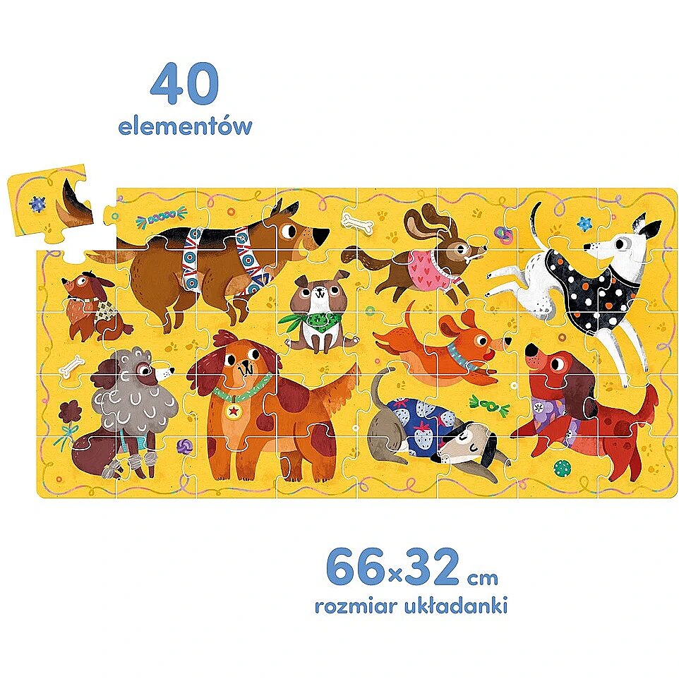 Description - Puzzle 40 elements Woof - Dogs Woof, woof! Play with us doggies while improving your fine motor skills and perceptiveness! The lusciously colourful, large jigsaw puzzle consists of 40 pieces. It depicts 10 adorable dogs, doggies and pooches that want to play! This is the perfect gift idea for a preschooler, not just a fan of barking four-legged dogs. Stacking puzzles is an all-around developmental pastime to which you should invite friends. Woof! A unique feature: the beautifully illustrated puzzles encourage a variety of play activities. Have fun and hone a variety of skills. The 40-piece Woof Dog Puzzle is a sensational idea for the next puzzle challenge for the three-year-old and the older child. The curious preschooler will absorb new knowledge and hone their skills with each passing day, which comes naturally through play. The adorable dogs and pooches inspire lots of developing play. Try: Put together a puzzle Count the dogs Give them names Make up stories about them Draw their own dogs Play at finding details in an illustration Pretend to be dogs bark and move like them! Let your imagination run wild and have fun, woof, woof!