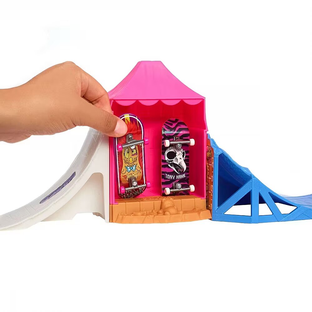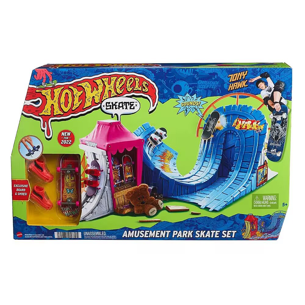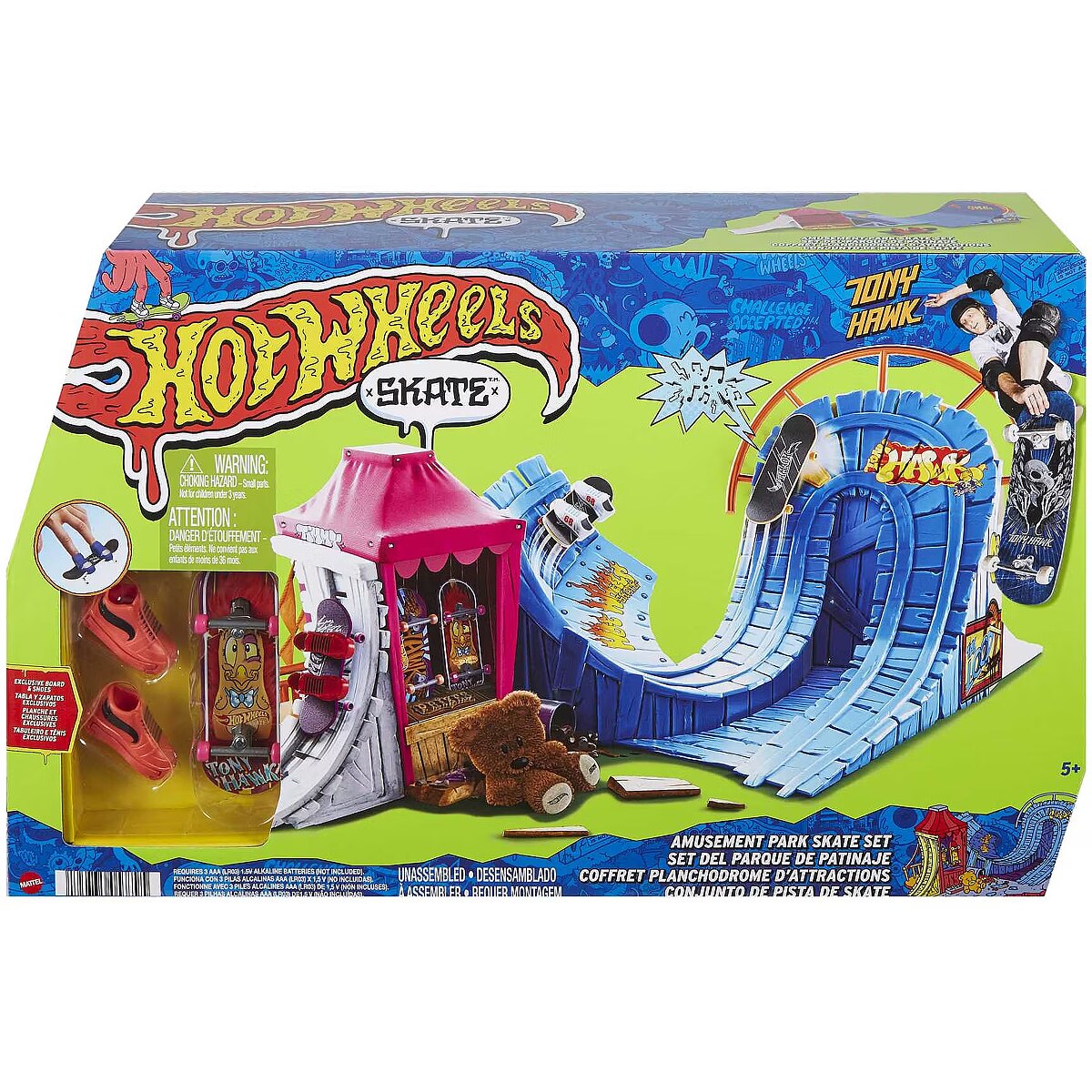 Description - Finger Skate Amusement Park set The Hot Wheels Skate Amusement Park set is the ultimate skater set with amazing obstacles, cool designs and sounds for endless fun! This versatile set is ready to perform amazing stunts on your toes. It includes ramps, ledges, handrails and half pipes, as well as buttons to activate uplifting music. The fretboard design was created in collaboration with skateboarding legend Tony Hawk and offers a pair of removable skateboard shoes for the ultimate skateboarding experience and breathtaking tricks. The set can be expanded with additional sets to create a colossal skatepark for unlimited skate fun. All pieces sold separately. Colour and design variations reserved.