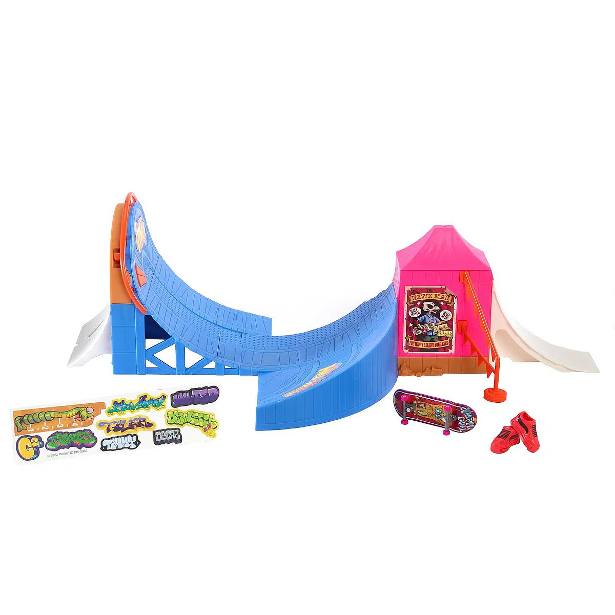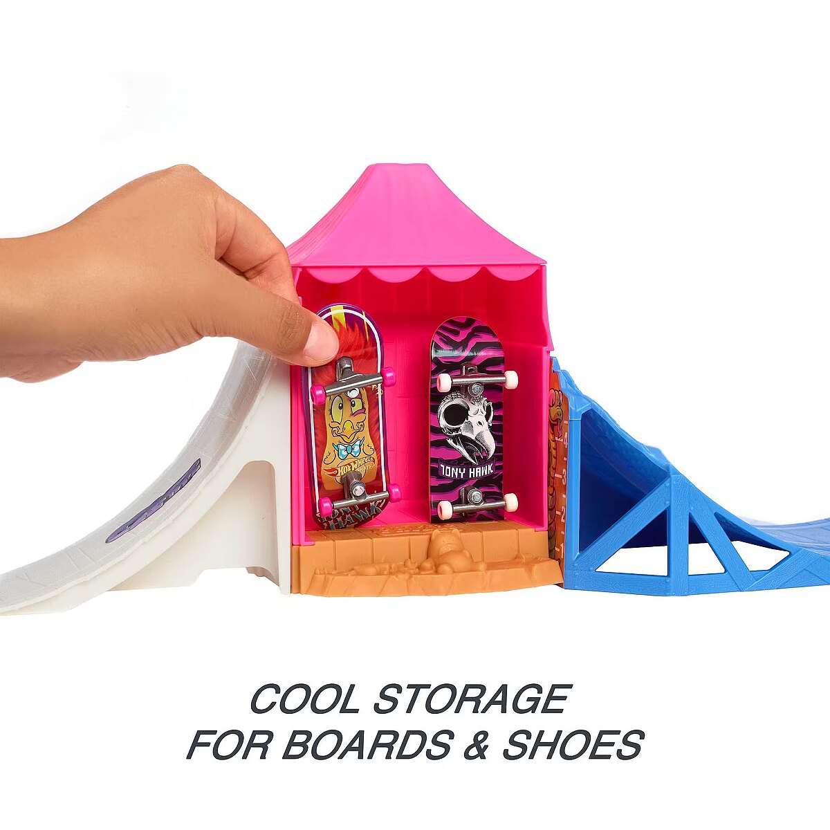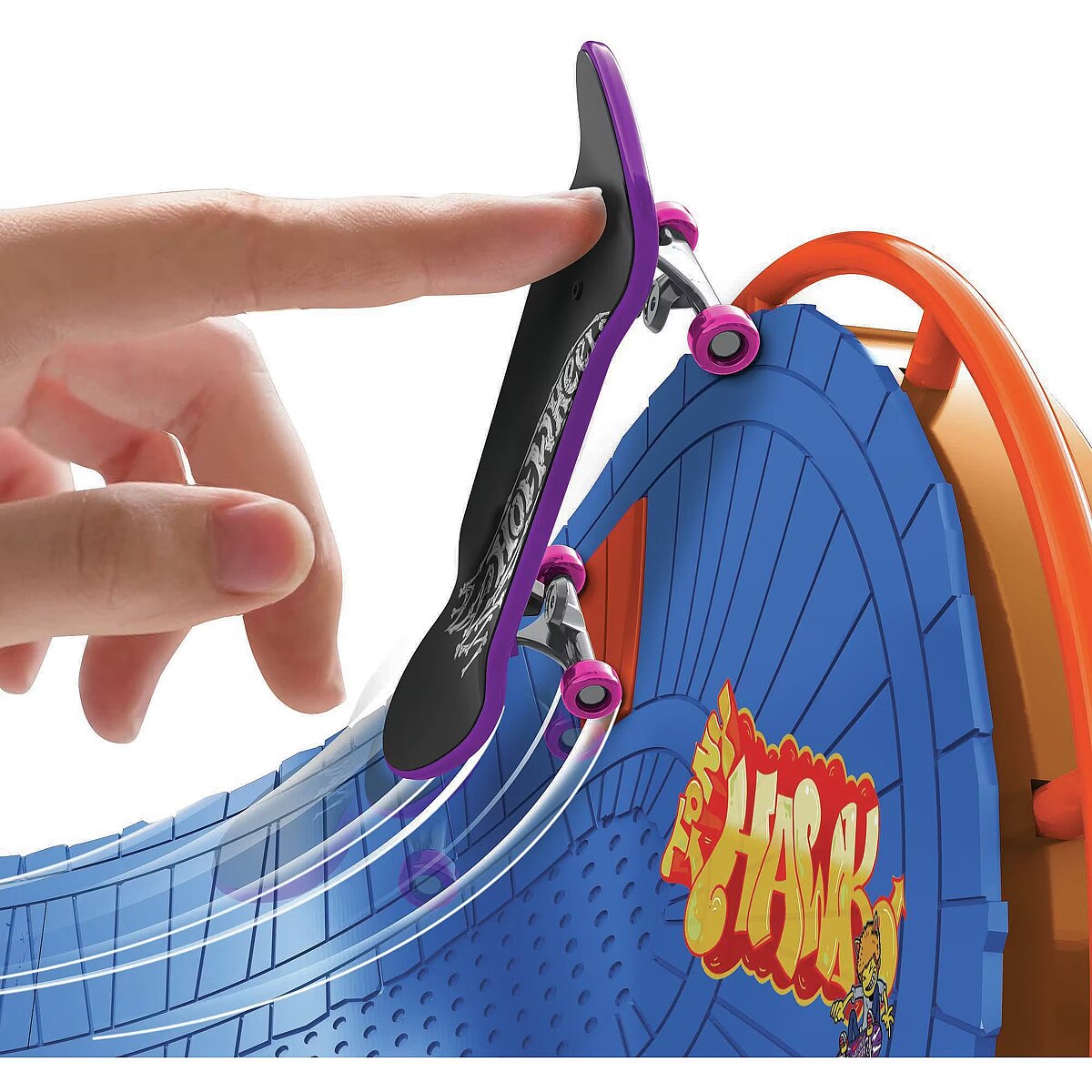 Description - Finger Skate Amusement Park set The Hot Wheels Skate Amusement Park set is the ultimate skater set with amazing obstacles, cool designs and sounds for endless fun! This versatile set is ready to perform amazing stunts on your toes. It includes ramps, ledges, handrails and half pipes, as well as buttons to activate uplifting music. The fretboard design was created in collaboration with skateboarding legend Tony Hawk and offers a pair of removable skateboard shoes for the ultimate skateboarding experience and breathtaking tricks. The set can be expanded with additional sets to create a colossal skatepark for unlimited skate fun. All pieces sold separately. Colour and design variations reserved.