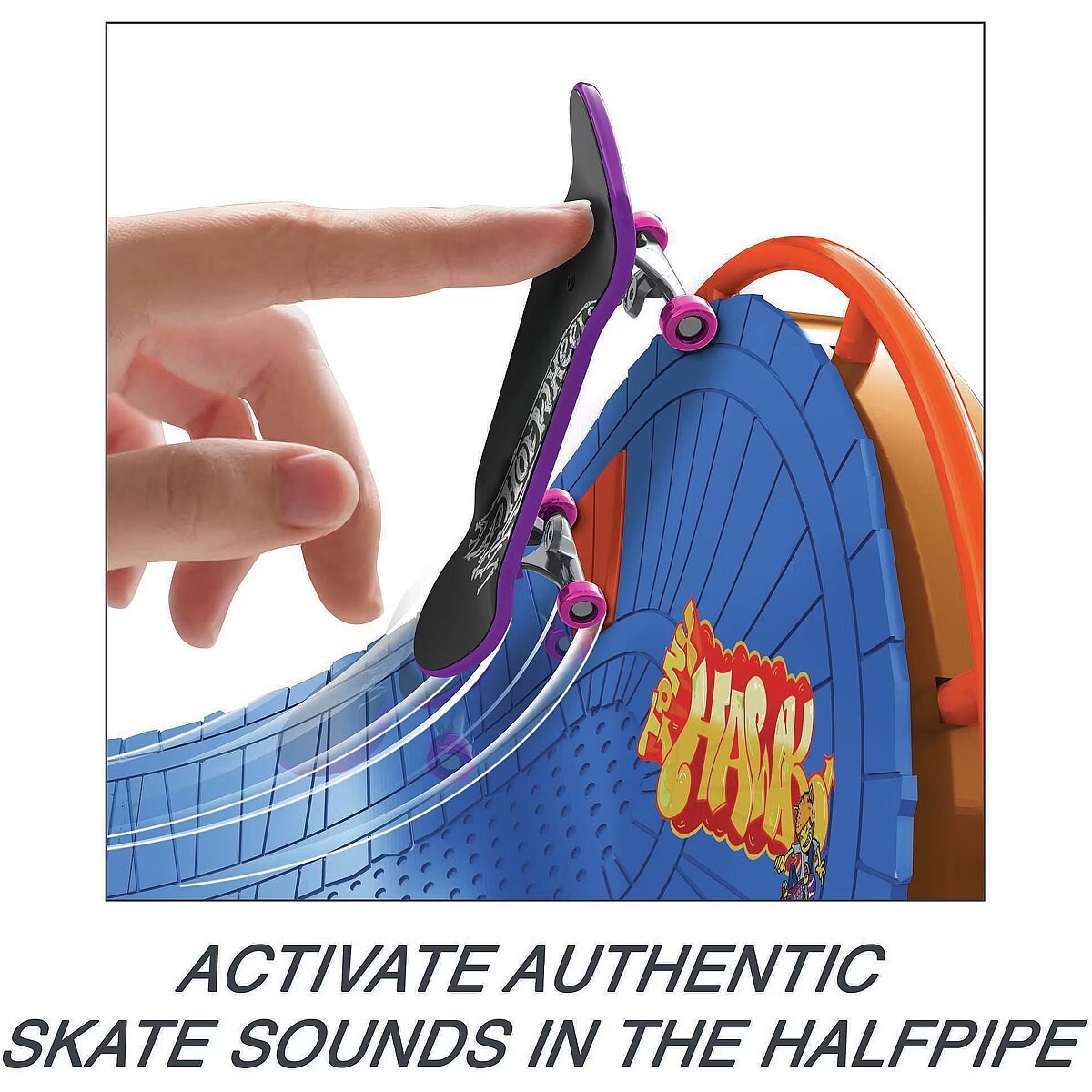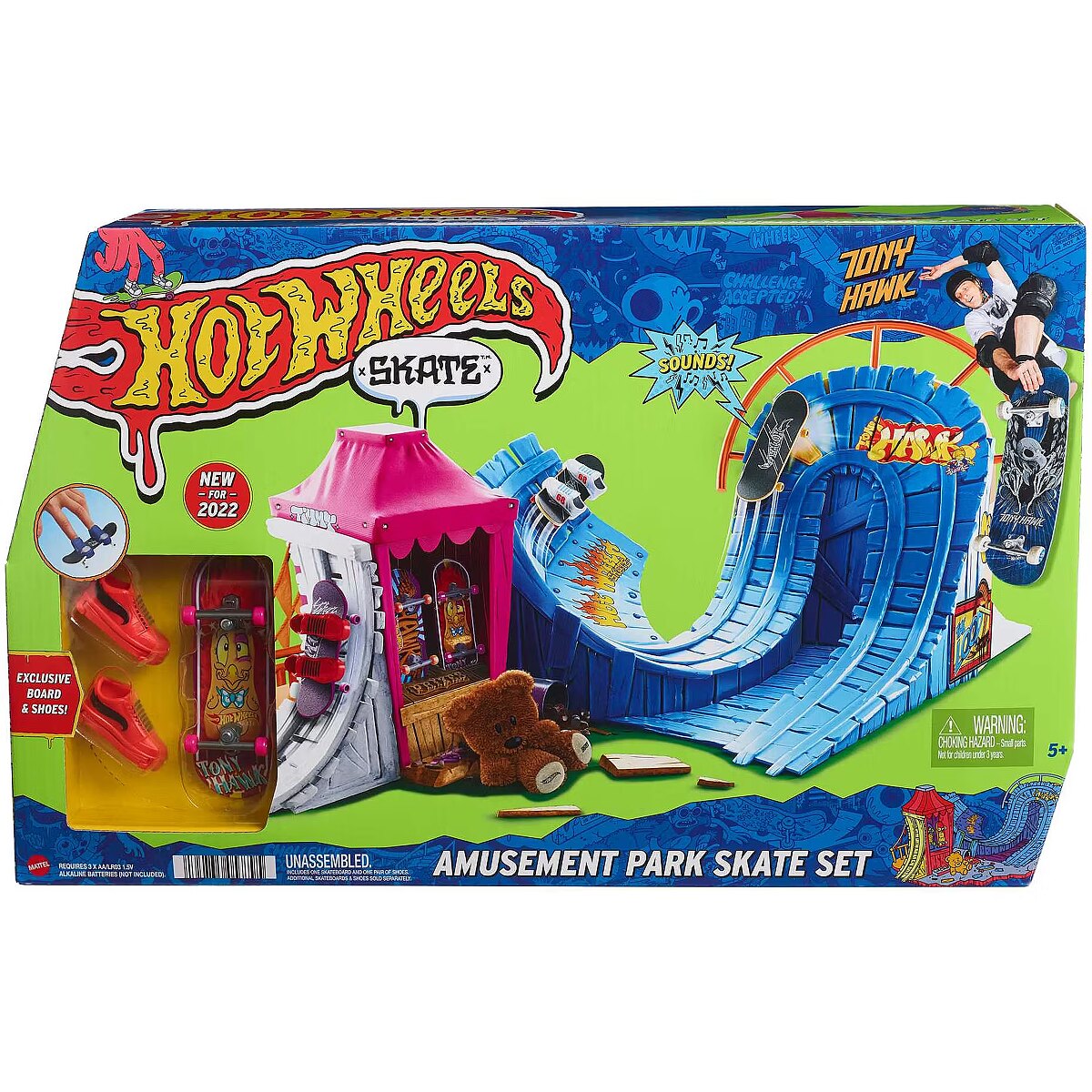 LongDesc - The Hot Wheels Skate Amusement Park Skate Set is the ultimate skate destination packed with wicked obstacles, rad designs and skate-activated sounds for an amped-up play experience! This massive playset is ready for epic finger-boarding stunts with ramps, ledges, rails and halfpipes as well as trigger buttons that activate awesome music mid-shred. It comes with a board designed in collaboration with legendary skater Tony Hawk and a pair of removable skate shoes that help groms get the feel of the board as they master tricks. Pair this set with other sets to create a colossal skate park with unlimited stunting possibilities. Each sold separately, subject to availability. Colours and decorations may vary.