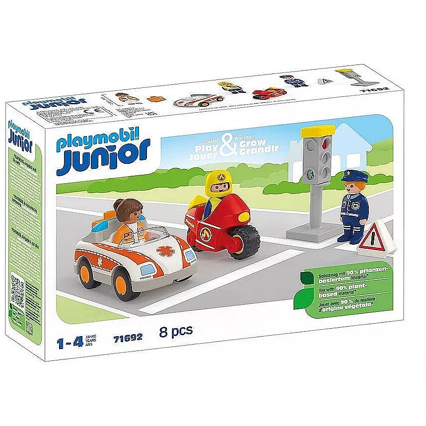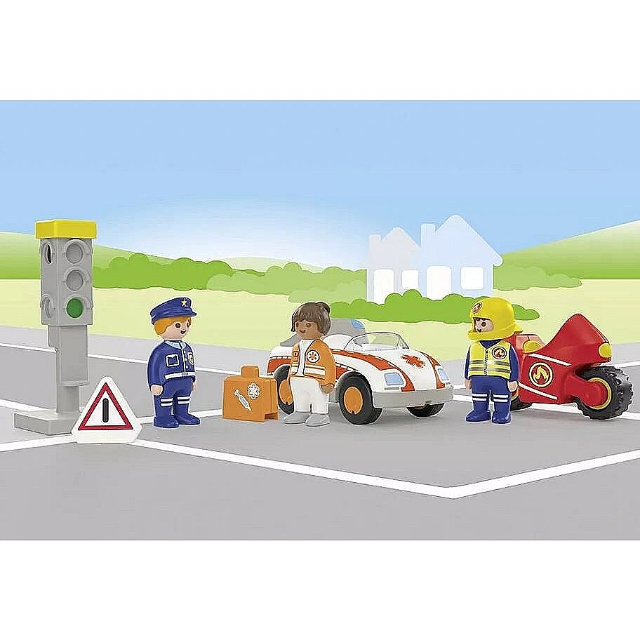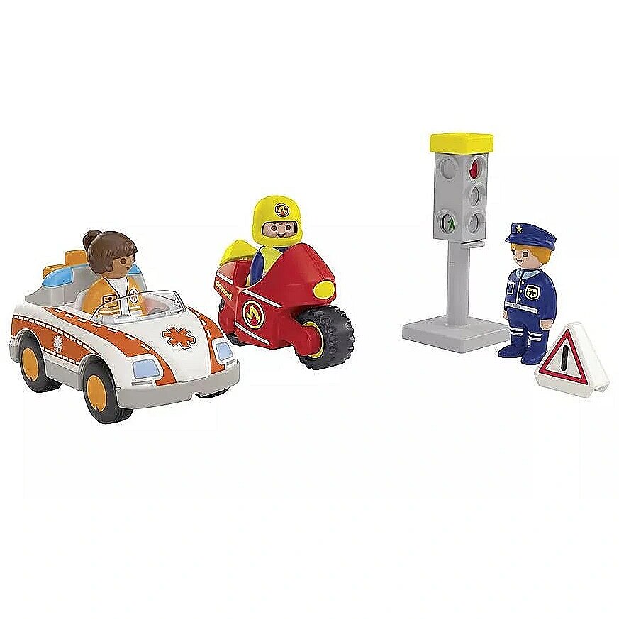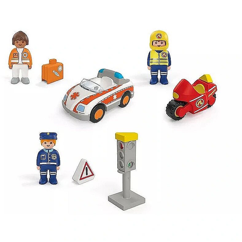 Accessories included - Strażak Policjant Lekarz pogotowia ratunkowego Motocykl strażacki Sygnalizacja świetlna Trójkąt ostrzegawczy Pojazd ratunkowy Apteczka ratunkowa