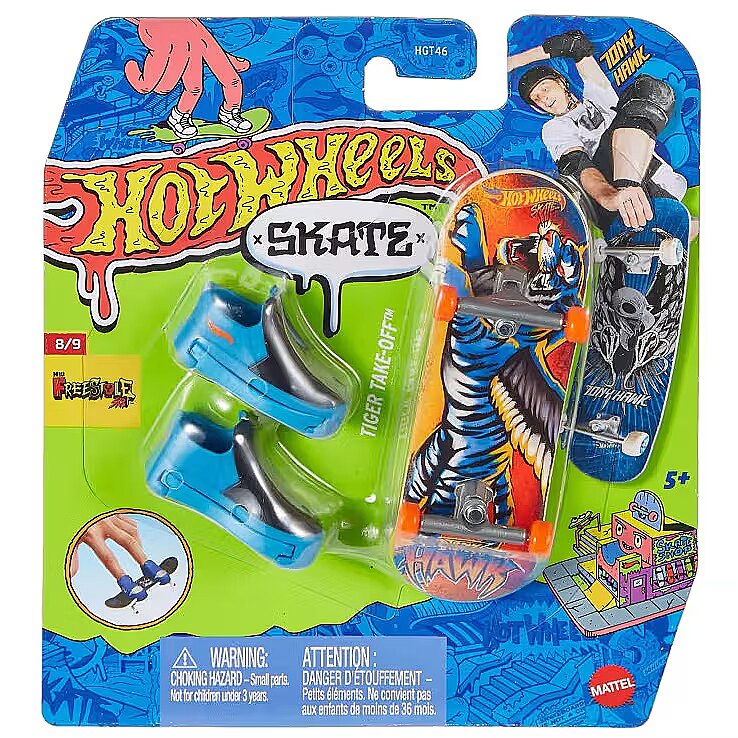 LongDesc - Hot Wheels and skateboarding legend Tony Hawk have teamed up to create an epic fingerboard collection that's prime for sick stunting and elite moves. Each fully assembled Hot Wheels fingerboard comes with a pair of stylish, removable skate shoes, designed to keep fingertips in place when learning to shred and ollie like a pro. Groms can build confidence and get the feel for the board and its movements before removing the shoes and trying more difficult maneuvers. Each board has a design that's so unique and cool, kids will want to collect them all. Each sold separately, subject to availability. Colours and decorations may vary.