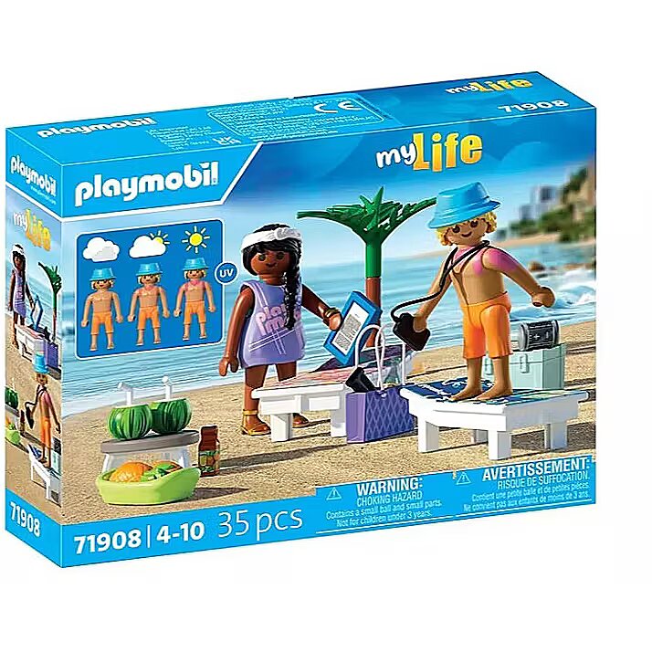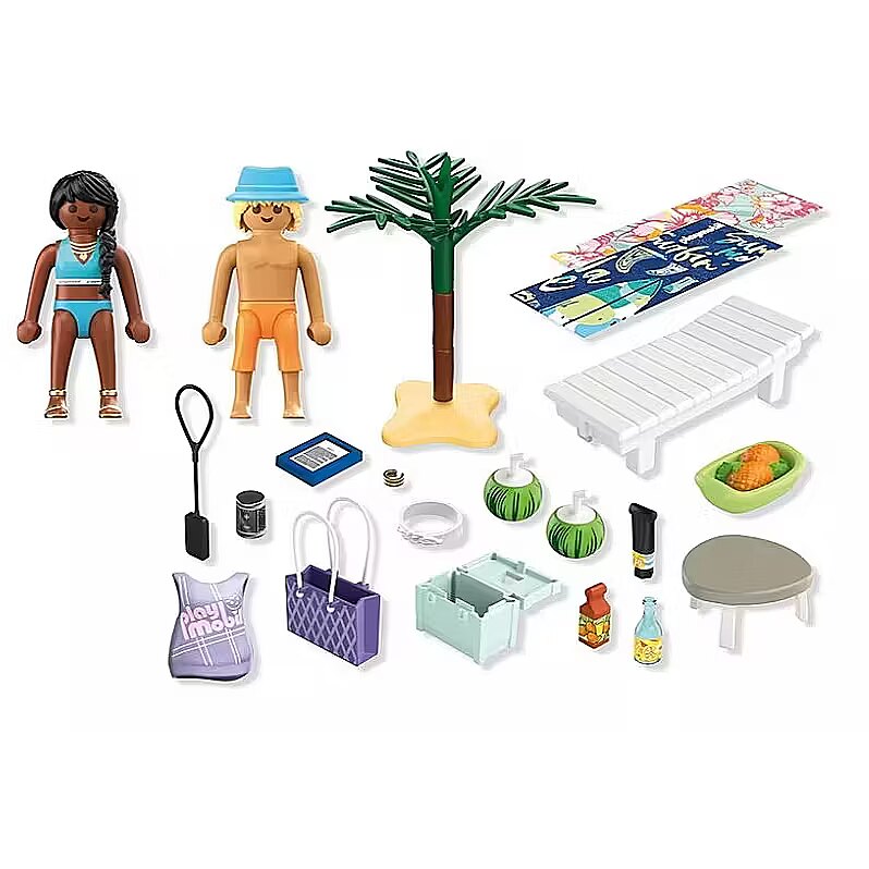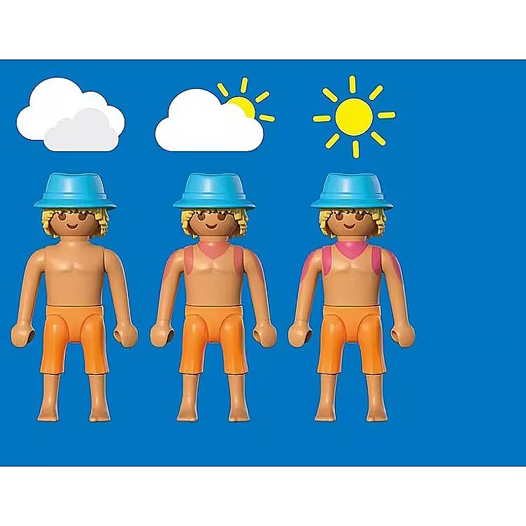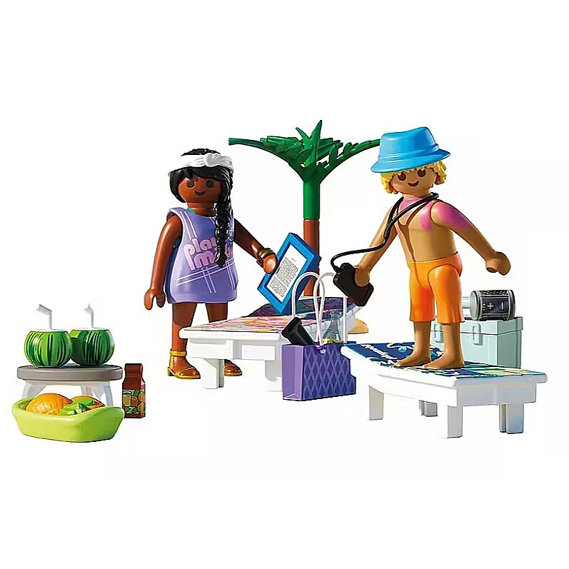 Description - Beautiful weather, sunshine, and the sound of the sea-a perfect day to relax on a deck chair under a beach umbrella. The couple enjoys cool drinks and delicious fruit. Unfortunately, the young man applied sunscreen too late and got a sunburn. Time for total beach relaxation with PLAYMOBIL! The Sunny Beach Trip for Two set captures the full summer vibe-from stylish deck chairs and fruity drinks to the shade of a palm tree and a changeable outfit for the woman. The man features a UV-sensitive print that shows a sunburn effect in real sunlight-dont forget the sunscreen! Pack all the essentials in the beach bag and cooler to enjoy the perfect day by the sea. This PLAYMOBIL set, full of fun details, is ideal for recreating holiday scenes and creative summer play!