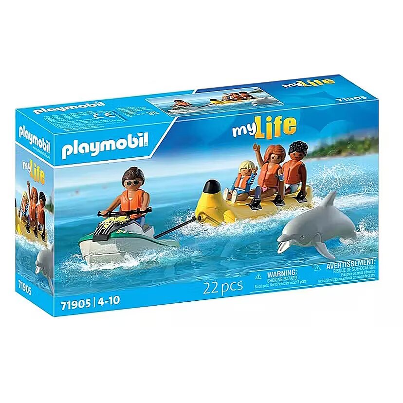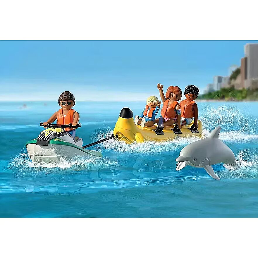 Kirjeldus - Vau! Kiirus, millega jetski banaani paati veab, pakub tõelist põnevust. Värske mereõhk ja pritsiv vesi puudutavad põnevil puhkajate nägusid. Päästevestid seljas naudivad nad sõitu lainete üle. Hetkeks liitub nendega delfiin, kes naudib sama palju lõbu kui nemad. Hoia kinni – on aeg banaani paadiga sõita! PLAYMOBILi komplekt mahutab kolm figuuri, millel on tugevad külgkäsipidemed ja jetski, mis on valmis seda vedama, et pakkuda tegevusrikast ja märga seiklust. Olgu see siis lainete ületamine või sõbraliku delfiiniga mängimine, lõbu ei lõpe kunagi. Vesijett mahutab ühe figuuri ja ühendub kaasasoleva varrastega kergesti banaani paadiga. Eemaldatavad päästevestid tagavad ohutu mängimise. Komplekt sisaldab nelja figuuri, delfiini ja palju puhkuse meeleolu – ideaalne suvise vee-seikluse taasesitamiseks!