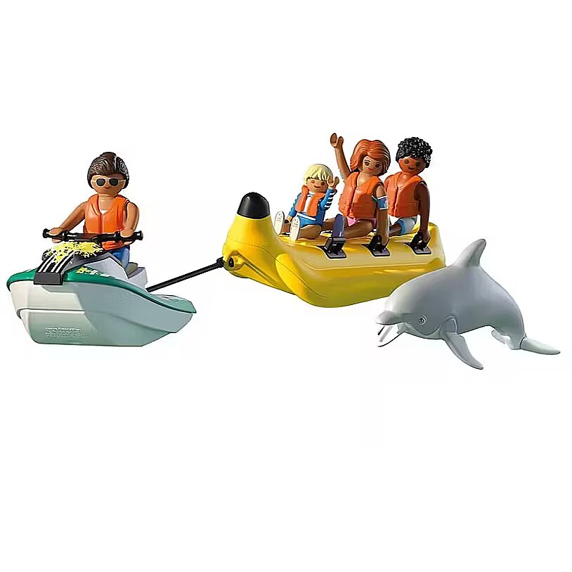 Description - Wow! The speed at which the jet ski pulls the banana boat gives a real thrill. The mix of fresh sea breeze and splashing water hits the faces of the excited holidaymakers. Wearing life jackets, they enjoy the ride across the waves. For a moment, a dolphin joins in, having just as much fun as they do. Hold on tight-its time for a banana boat ride! The PLAYMOBIL set accommodates three figures, with sturdy side handles and a jet ski ready to tow it for an action-packed, wet adventure. Whether racing across the waves or playing with a friendly dolphin, the fun never ends. The jet ski holds one figure and easily connects to the banana boat with the included rod. Removable life jackets ensure safe play. The set includes four figures, a dolphin, and plenty of holiday vibes-perfect for recreating summer adventures on the water!