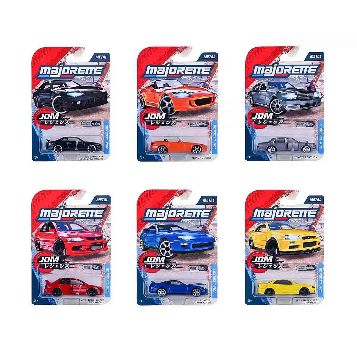 Kirjeldus - Majorette Japan Legends Premium, 6 tüüpi metallist sõidukid tuntud autotootjate litsentside alusel: Nissan, Mitsubishi, Toyota ja Honda piiratud tiraažiga Japan series. Avatavad osad Vaba ratas Mõõtkava 1:64 Pikkus: 7,5 cm Erinevad disainid. Toode saadetakse juhuslikult, konkreetse mudeli valik ei ole võimalik. Hind kehtib 1 tüki kohta.