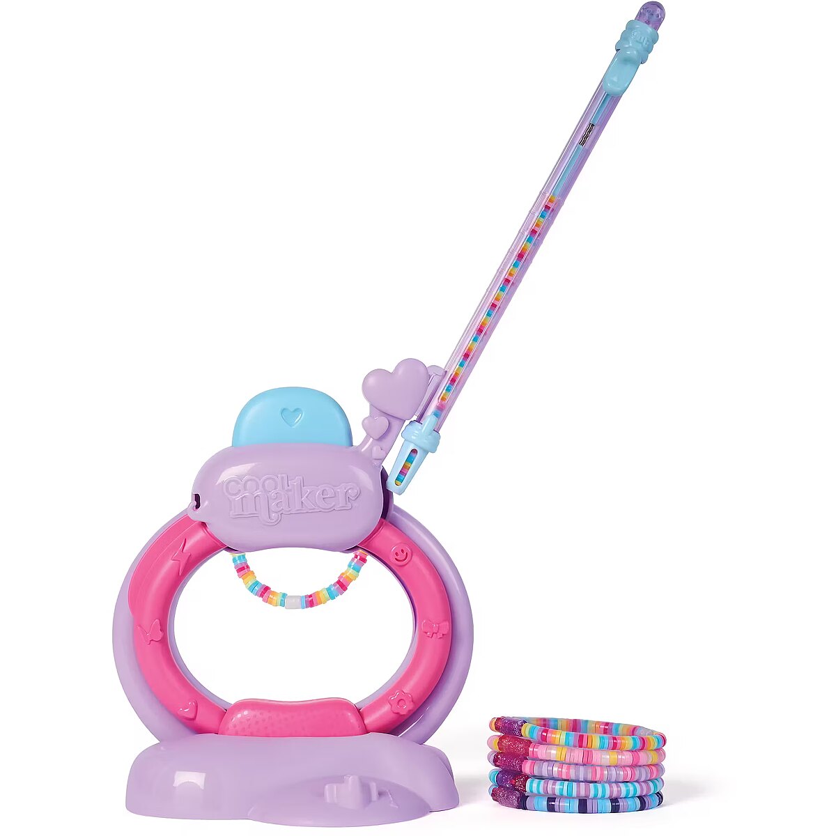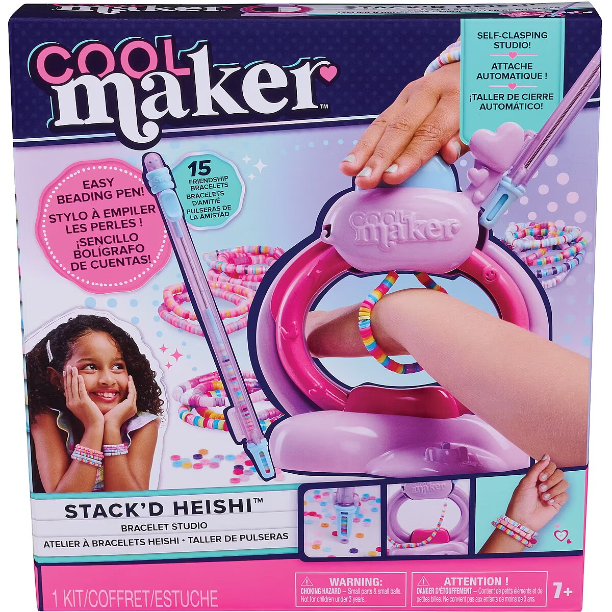 LongDesc - Create stylish heishi bracelets in a snap with the Cool Maker Stack’d Heishi Bracelet Studio. This all-in-one bracelet kit comes with everything kids need to easily make 15 bracelets, including over 1200 colorful heishi beads, 10 feature beads, a beading pen, and more. Girls can easily find their wrist size using the measuring guide, matching the symbol with the one on the pen to make the right size bracelet. Pick up beads with the pen and watch the design stack inside, then release the beads in the studio, right onto the string. Slide the wrist through the studio and press the button to make the bracelet magically clasp together. This Cool Maker bracelet maker will spark imagination as girls customize their own unique stacks or follow the included design guide, then stack their bracelets and wear and share with their BFFs. Whether you’re looking for engaging kids activities for sleepovers, parties, back-to-school, rainy days or for every day, the Stack’d Heishi Bracelet Studio is a welcome addition to your DIY jewelry making supplies, craft supplies and craft kits. Easily stack, string and snap with the Cool Maker Stack’d Heishi Bracelet Studio.Includes: 1 Stack’d Heishi Bracelet Studio, 1 Beading Pen, 1 Wrist Measurement Ruler, 1220 Heishi Beads, 10 Feature Beads, 17 Strings, 16 Clasps (in 2 Parts), 1 Instruction Sheet