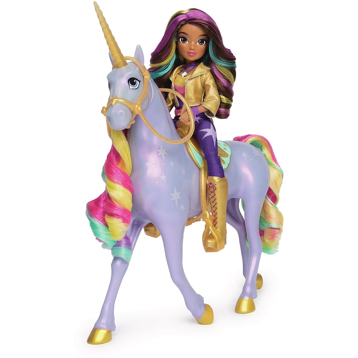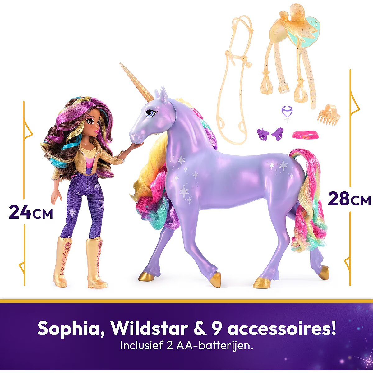 LongDesc - Discover your destiny with Unicorn Academy Sophia & Rainbow Light-up Wildstar! Inspired by the NETFLIX animated show and best-selling book series, kids can recreate the magical bonding moment from the show with 11-inch interactive Wildstar and the 9.5-inch Sophia doll! Wildstar responds to touch with rainbow lights, sound effects and songs from the show! Rub Wildstar’s face, touch her horn, and pull her reins to see her react! As your bond builds, Wildstar’s white Light Magic markings and horn shine brighter, changing to rainbow when you’ve earned her trust. Hold her face to complete the bond and you’ll hear Wildstar celebrate with the show’s theme song! After bonding, hold Wildstar’s face to replay music, touch her horn for guiding light and more! Pose Sophia on Wildstar and ride into adventure! Expand your Unicorn Academy world with the fashion dolls and unicorns (each sold separately). For kids who enjoy unicorns and horse toys, dolls & accessories, doll house play, collectibles, plush toys and more, Unicorn Academy toys are fun birthday gifts for girls or gifts for any occasion. Includes 2 AA batteries and features songs in English and instrumental. Experience the extraordinary with Sophia & Rainbow Light-up Wildstar!Includes: 1 Unicorn, 1 Doll, 1 Removable Saddle, 1 Removable Bridle, 6 Removable Fashion Pieces, 1 Hair Styling Tool, 1 Quick Start Guide, 1 Instruction Sheet