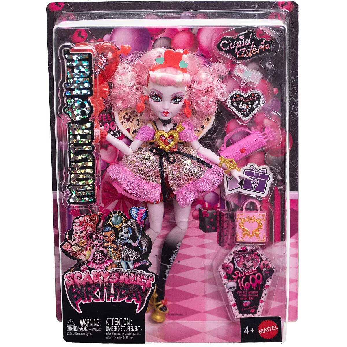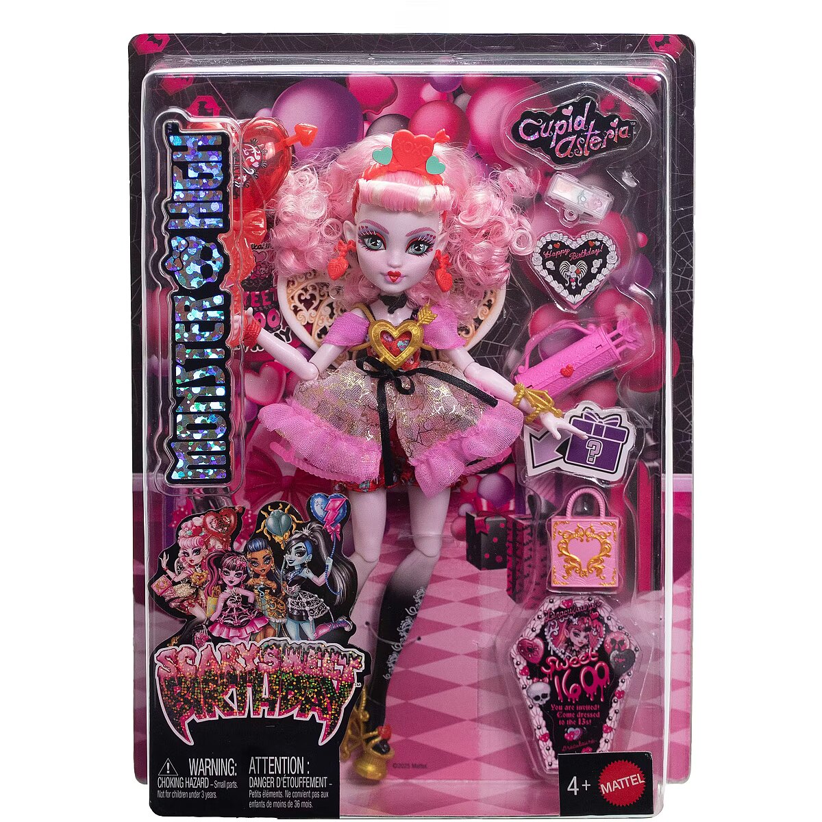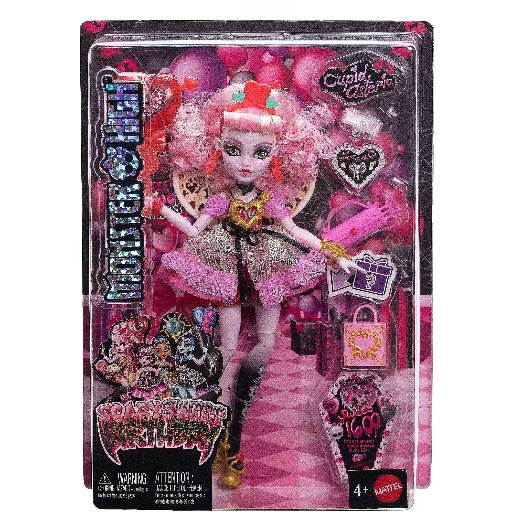 Lühikokkuvõte - Monster High Scary Sweet Birthday Cupid Asteria nukk pidulikus kleidis koos õhupalli ja kingitusega, moenukk, naine, 4 aastat, poiss/tüdruk, 290 mm, 250 g