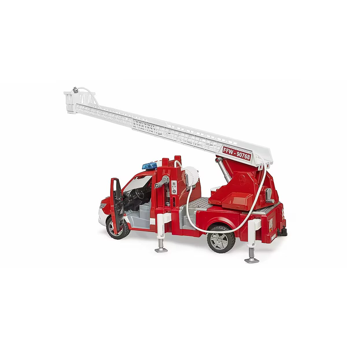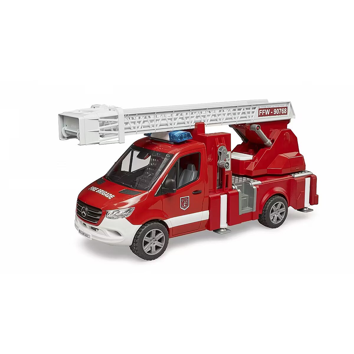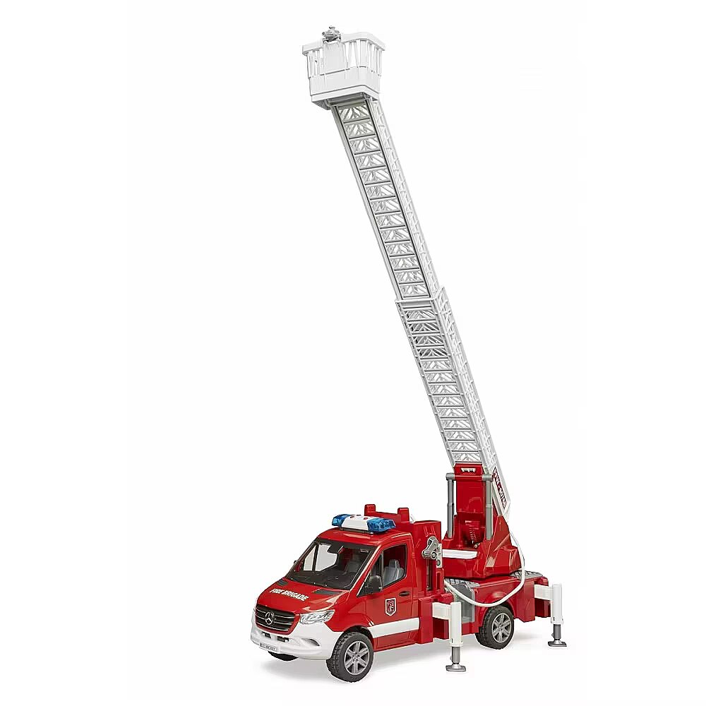 Description - Bruder 02673 Mercedes Sprinter fire engine with light and sound module Pioneering, efficient, reliable - that's how Mercedes Benz describes the new Sprinter. Even in its latest generation it remains a versatile and universally popular transport professional. For difficult-to-fight fire sources, such as the narrow streets of old towns, smaller fire engines are increasingly being used. The Sprinter has proven itself here because of its enormous maneuverability. BRUDER has equipped this fire engine with many realistic functional details. The emphasis is on the extendable swivel ladder with rescue cage and the fully functional water sprayer with visible working piston pump, water tank and extendable support legs, various tool holders and a new light and sound module complete the very high value of this vehicle. The toy features: Rubber, soft, molded tread Opening driver's cab doors Glazed cab A ladder that can be raised and extended using knobs Water can be filled and actually pumped through the rubber hose Extendable ladder for approx. 70 cm Hose reel Retractable outriggers Possibility of attaching a trailer, Light and sound module (02801) Side mirrors Fits all bWorld figures