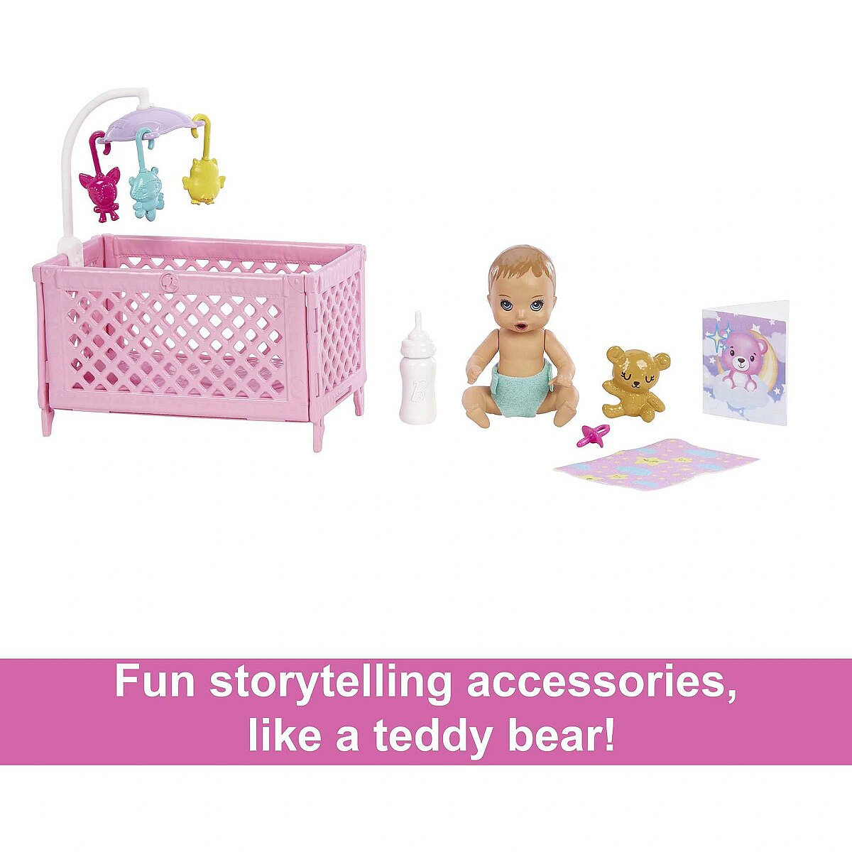 LongDesc - This bedtime-themed Barbie Skipper Babysitters Inc. playset inspired by the movie lets kids explore their nurturing side with Skipper doll, a baby doll -- with dreamy sleep feature -- a crib and storytelling pieces. Help give baby a bottle or pacifier and watch their eyes grow sleepy! Kids can collect all the Babysitters Inc. dolls and toys for endless Barbie babysitting adventures (each sold separately, subject to availability). Dolls cannot stand alone. Colours and decorations may vary.