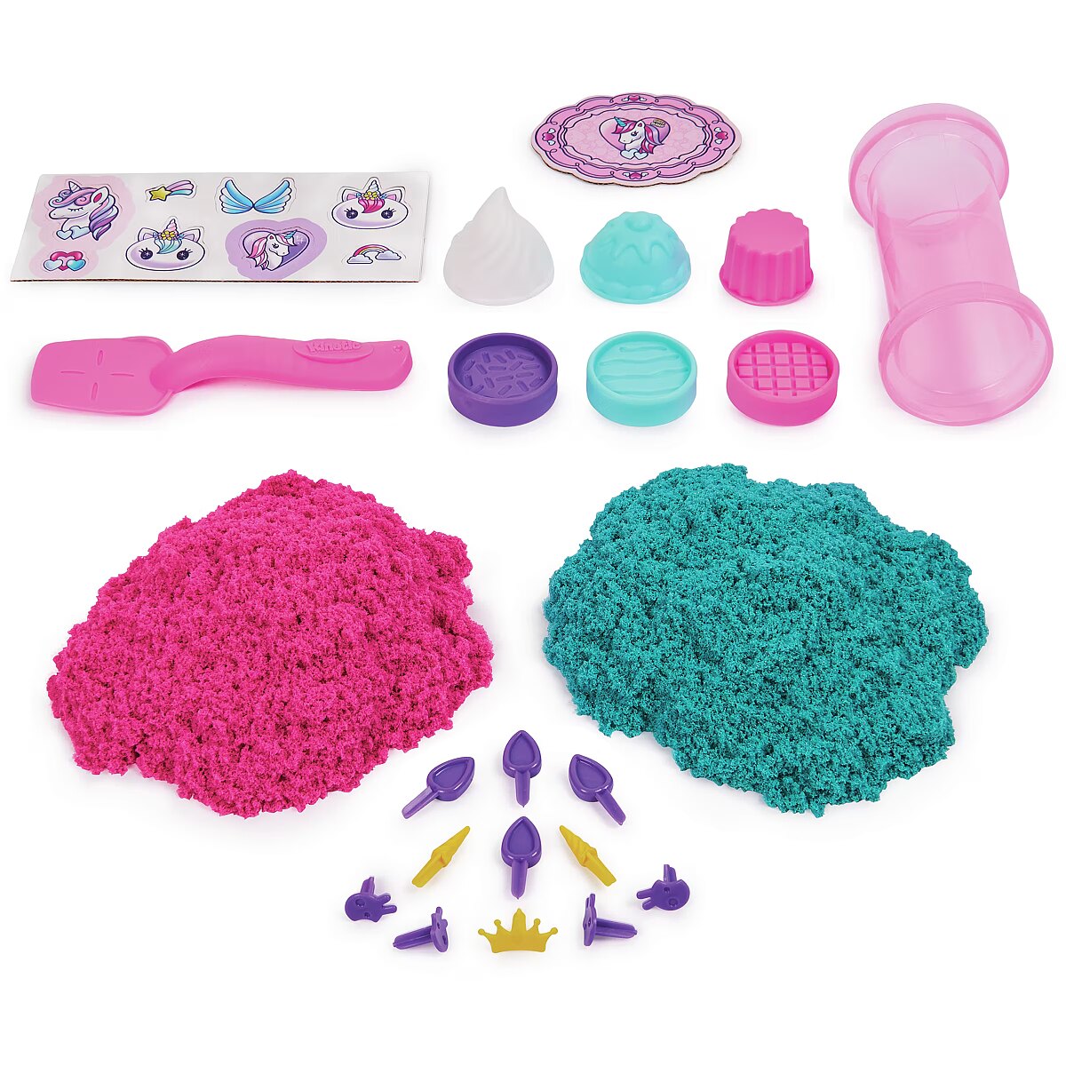 LongDesc - Run the ultimate Kinetic Sand Unicorn Bake Shoppe! This playset features 16oz of Kinetic Sand: 8oz of shimmer teal and 8oz of pink neon sand! Create unicorn cupcakes with the molds and tools! This set includes 3 cupcake molds, roller, spatula, 6 unicorn-themed accessories. Kinetic Sand is the original magical, moldable and mesmerizing play sand. Better than arts and crafts modeling clay, this sensory sand never dries out, so you can play with Kinetic Sand for hours of tactile independent play. It’s a great addition to sensory bins. Let it flow through your hands – it’s so satisfying, you won’t be able to put it down! Kinetic Sand is made with natural sand and is non-toxic and hypoallergenic. It magically sticks together and cleans up easily. Kinetic Sand develops creative and sensory skills and allows kids to create anything they can imagine! Kinetic Sand kids toys for 3 year old boys and girls are the perfect gift for kids.Includes: 8oz of shimmer Kinetic Sand, 8oz of Neon Kinetic Sand, 1 spatula, 3 cookie stampers, 1 roller, 3 cupcake molds, 11 accessories, 1x scene punch-outs