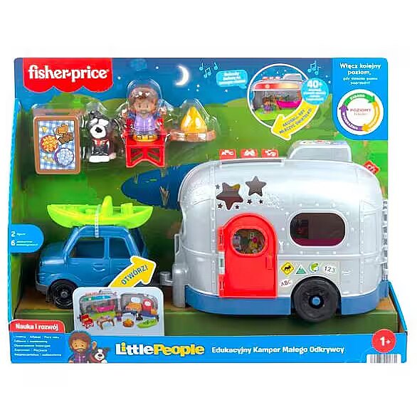 Description - Fisher-Price Little People Educational Camper for Little Explorers Explore uncharted territory and make up your own camping stories with the Little People Educational Little Explorer Camper set from Fisher-Price. Little campers can set off on an adventure - just pack the figures into the car, attach the camper and head off. Once parked, open the camper to reveal a whole set full of camping fun with 2 figures and 4 accessories. Press the buttons on top of the camper to activate lights, music and camping statements. A 2-in-1 set with a vehicle to push, colourful lights, music, songs and statements for educational fun 3 learning levels teach letters, counting from 1 to 10, weather and seasons You can attach the camper to the vehicle and set off for your next adventure. The set includes a camper, a car, 2 figures (including a dog) and 4 accessories: a canoe, a chair, a table and a campfire For toddlers and preschoolers from 1 to 5 years old