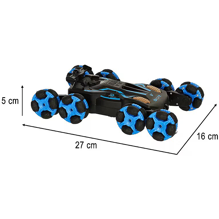 description_lv - Neparasti-tas ir veids, kā aprakstīt šo tālvadības automašīnu! Un kas padara to izceļas? Pirmkārt, 8 riteņi, kurus var manevrēt tādā veidā, ka automašīna pārvarēs visus šķēršļus – pat kāpnes. Kontrolierī papildus klasiskajām pogām automašīnas vadīšanai četros virzienos ir arī riteņu pārveidošanas funkcija. Tas ļauj bērniem viegli mainīt šasijas augstumu, pielāgojot to dažādām virsmām un šķēršļiem. Automašīnai ir vairākas papildu funkcijas, kas padarīs atskaņošanas laiku patīkamāku: mūzika, gaismas un pat izplūdes gāze, no kuras izplūst tvaiks. Komplektā ietilpst arī rokas kontrolieris, kas ļauj vadīt automašīnu, izmantojot žestus. Tehniskās specifikācijas: