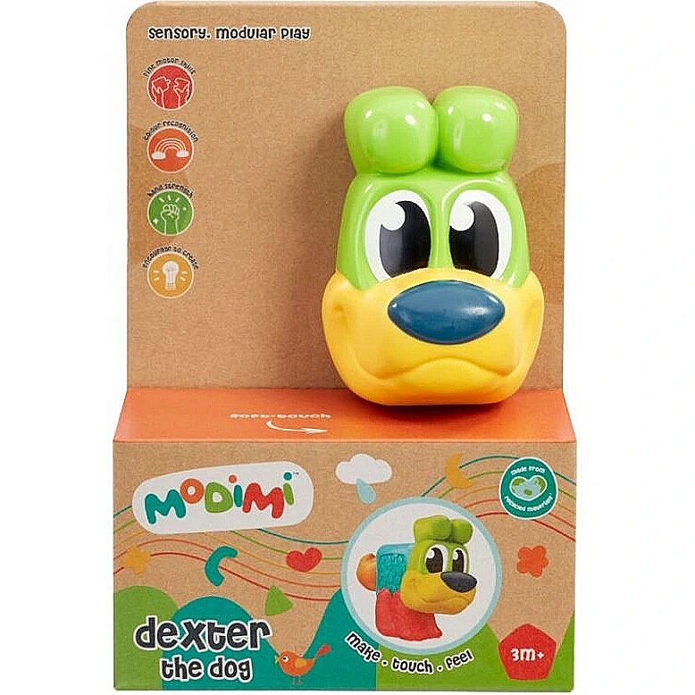 Description - MODIMI is an ecological, safe and modular toy system made of recycled plastic. The system uses sensory functions and was created to support your child's development at an early stage of life. Dexter the dog is a nice playmate for the youngest! The dog has a soft-touch rubber nose and muzzle, a textured block - belly, a set of dog paws and a tail. Modules from different Modimi sets can be combined with each other to provide your child with even more excellent, creative fun!