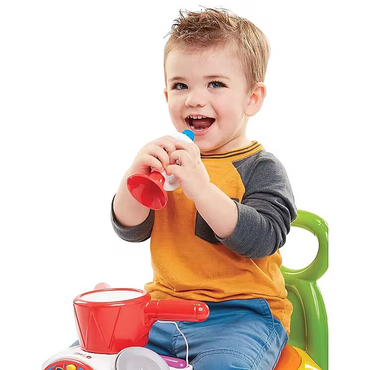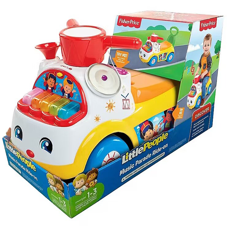 Description - The Fisher-Price multifunctional ride-on is designed for children aged 1236 months, weighing up to 20 kg. The child can sit on it and move by pushing with their feet. When the child starts taking their first steps, they can hold onto the handle at the back of the car. Under the seat, there is a storage compartment for small items. The transparent keyboard at the front of the ride-on has two functions: the first plays 5 cheerful march melodies, and the second allows the child to play freely. Pressing the keyboard also lights up colorful lights. The vehicle is equipped with instruments: a drum, a cymbal, a drumstick, and a removable trumpet. The ride-on plays cheerful melodies and automotive sound effects, such as engine starting. Benefits of the ride-on: develops skills and imagination, and helps improve the childs motor coordination. Package dimensions: L 53 cm × W 26 cm × H 33 cm Ride-on dimensions: L 52 cm × W 25 cm × H 32 cm Seat height from floor: 19 cm Pieces per carton: 2 WARNING: Due to the material and design of the wheels, the ride-on may vibrate slightly when used on hard, uneven surfaces.