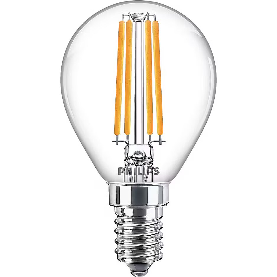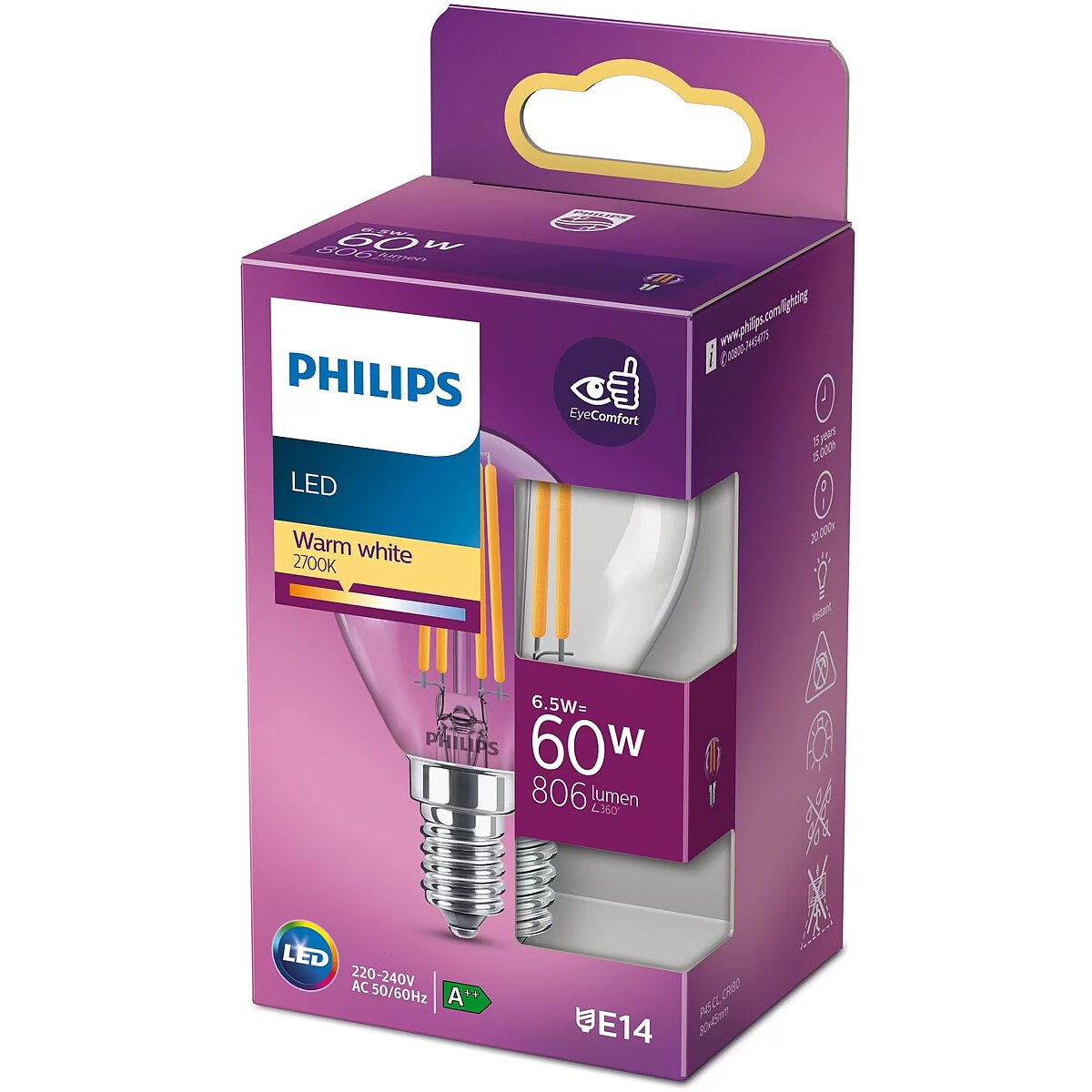 LongSummaryDescription - Philips Filament Candle Clear 60W P45 E14. Bulb power: 6.5 W, Equivalent bulb power: 60 W, Fitting/cap type: E14, Luminous flux: 806 lm, Bulb lifetime: 15000 h, Light colour: Warm white, Colour temperature: 2700 K, Color Rendering Index (CRI): 80, Power factor: 0.55