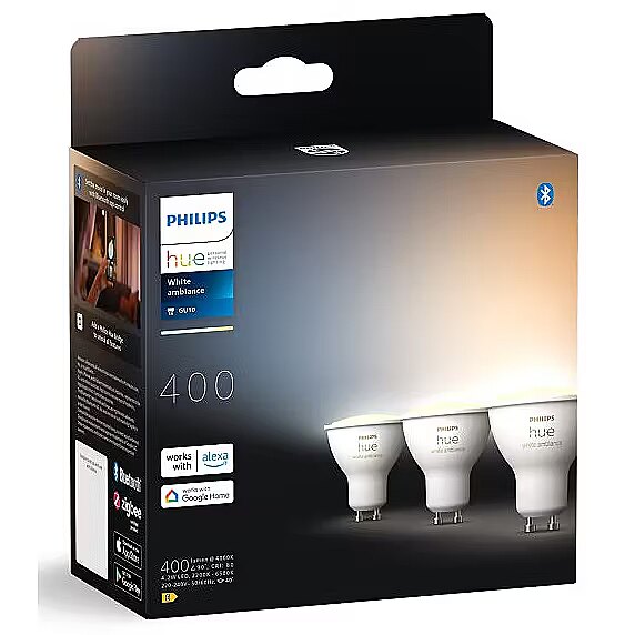 LongSummaryDescription - Philips Hue White ambience GU10 – smart spotlight – (3-pack). Type: Smart bulb, Interface: Bluetooth/Zigbee, Product colour: White. Mobile operating systems supported: Android, iOS. Energy efficiency class: E, Power consumption (standby): 0.25 W, Power consumption (max): 4.2 W. Width: 50 mm, Depth: 50 mm, Height: 57 mm. Package type: Box, Package width: 72 mm, Package depth: 72 mm