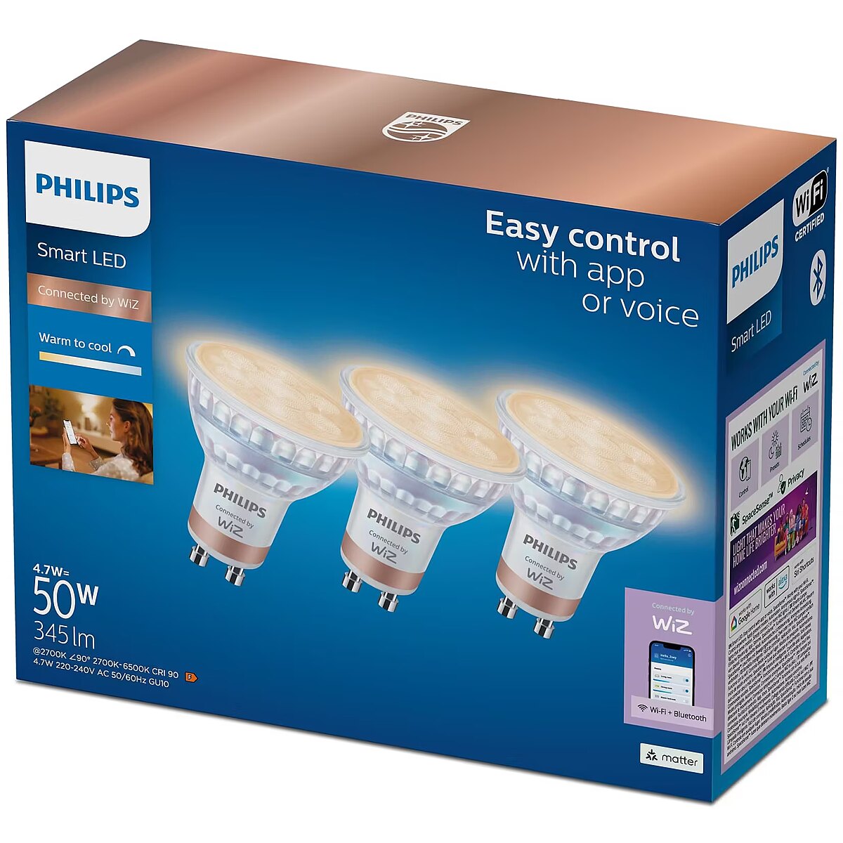LongSummaryDescription - Philips Spot 50 W PAR16 GU10 x3. Type: Smart bulb, Interface: Wi-Fi/Bluetooth, Product colour: White. Energy efficiency class: F, Input voltage: 220-240 V, AC input frequency: 50-60 Hz. Width: 50 mm, Depth: 55 mm, Height: 55 mm. Package width: 185 mm, Package depth: 71 mm, Package height: 144 mm. Quantity per pack: 3 pc(s)