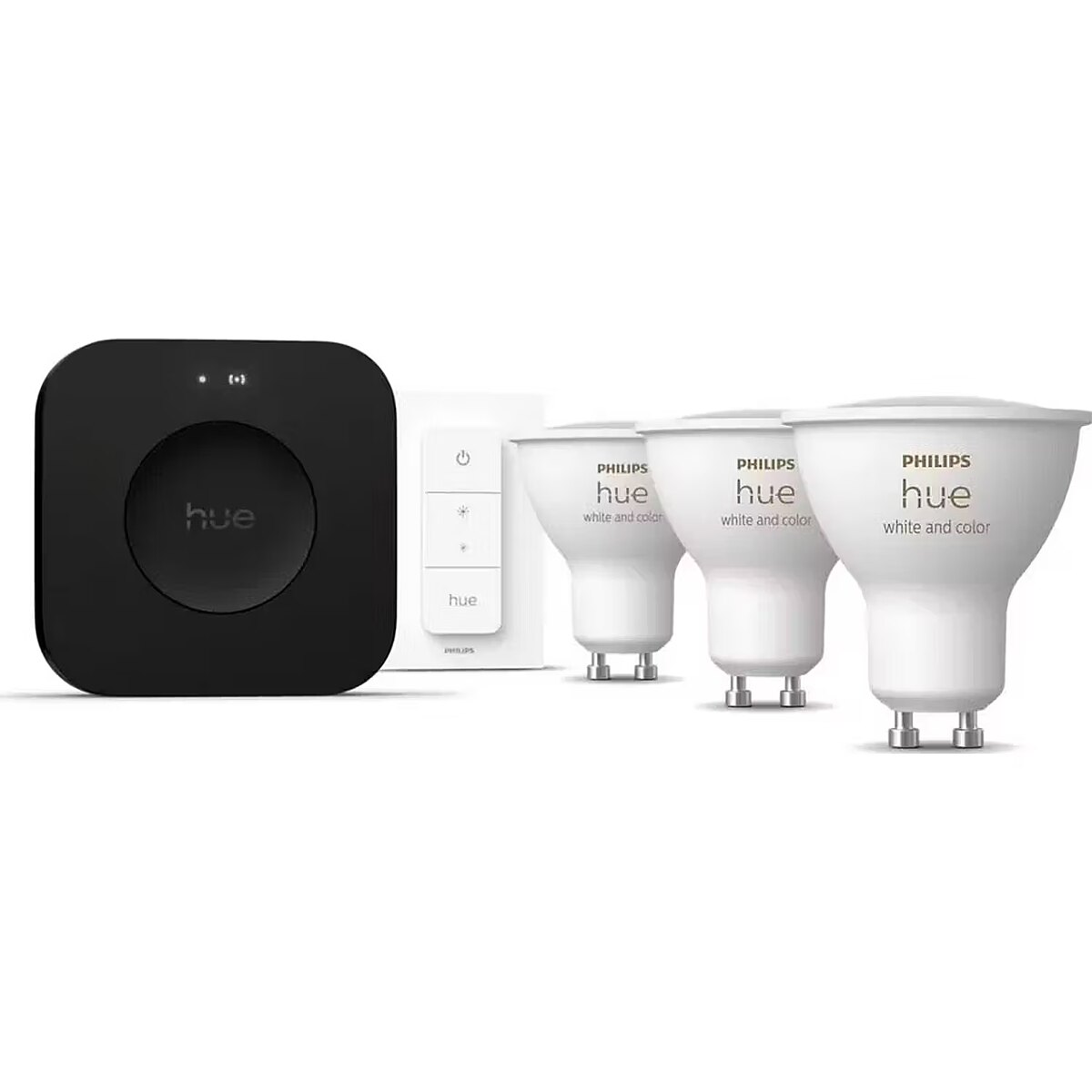 LongDescription EN - A complete smart lighting starter kitThe Philips Hue White & Color Ambiance starter kit with three GU10 bulbs, Hue Bridge Pro, and a wireless dimmer switch provides a powerful and flexible way to experience smart lighting. It offers intuitive control, advanced automation, and seamless integration across your entire home. Millions of colours and adjustable white lightThe included White & Color Ambiance GU10 bulbs deliver over 16 million colours along with a full range of warm to cool white light. This allows you to create the perfect atmosphere for work, relaxation, entertainment, or special occasions. Hue Bridge Pro – faster, stronger, smarterThe Hue Bridge Pro features a next-generation processor that delivers up to five times faster response times and significantly increased system capacity. It supports over 150 lights, more than 50 accessories, and up to 500 lighting scenes, ensuring a reliable and scalable smart lighting setup. Wireless dimmer switch for easy controlThe included wireless Hue dimmer switch lets you control your lights instantly without using a smartphone. Turn lights on or off, dim them, or adjust scenes with ease. It can be mounted on a wall or used as a handheld remote for maximum convenience. Hue MotionAware™ – lighting that responds to youExclusive to the Bridge Pro, Hue MotionAware™ enables your lighting to react intelligently to your movement. By using at least three lights in the same room, you can create a motion zone that automatically activates assigned lights without the need for a separate motion sensor. Secure and remote smart lighting controlUsing Zigbee technology, the system ensures secure and stable communication between devices. With the Hue app, you can control your lights from anywhere, set schedules, create automations, and manage your smart home effortlessly.
