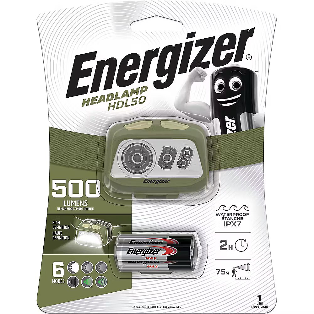 description_en - When you need your hands free, the Energizer HDL50 LED Head torch offers bright light with high CRI for clear colour definition. The compact head torch is lightweight and waterproof, so it can go wherever you go—outdoors in the rain, on a job site or just down to the basement. The perfect head torch for home and work, this bright light casts 500 lumens for up to 2 hours. Green LED mode preserves your night vision, while the head pivots to shine light wherever it’s needed. Patented Digital Focus lets you broaden or narrow your field of vision with a simple press of a button. An adjustable head strap, anti-glare design and shatterproof lens prepare you for what’s ahead. Three AAA batteries come included with this Energizer head torch LED light. Trust in Energizer to deliver the powerful performance we promise – Energizer lights are tested and adhere to strict, reliable ANSI standards. Energizer HDL50 LED Head torch with 3 Energizer AAA batteries Bright head torch delivers hands-free light with ample run-time The perfect head torch for home, work and outdoor activities Casts 500 lumens with a 246-foot beam for up to 2 hours IPX7 waterproof for use in all weather conditions, shatterproof lens and impact-resistant up to 6 feet A pivoting head to direct light, plus patented Digital Focus to broaden or narrow your field of vision Trust in the Energizer brand for reliable power and performance in any situation