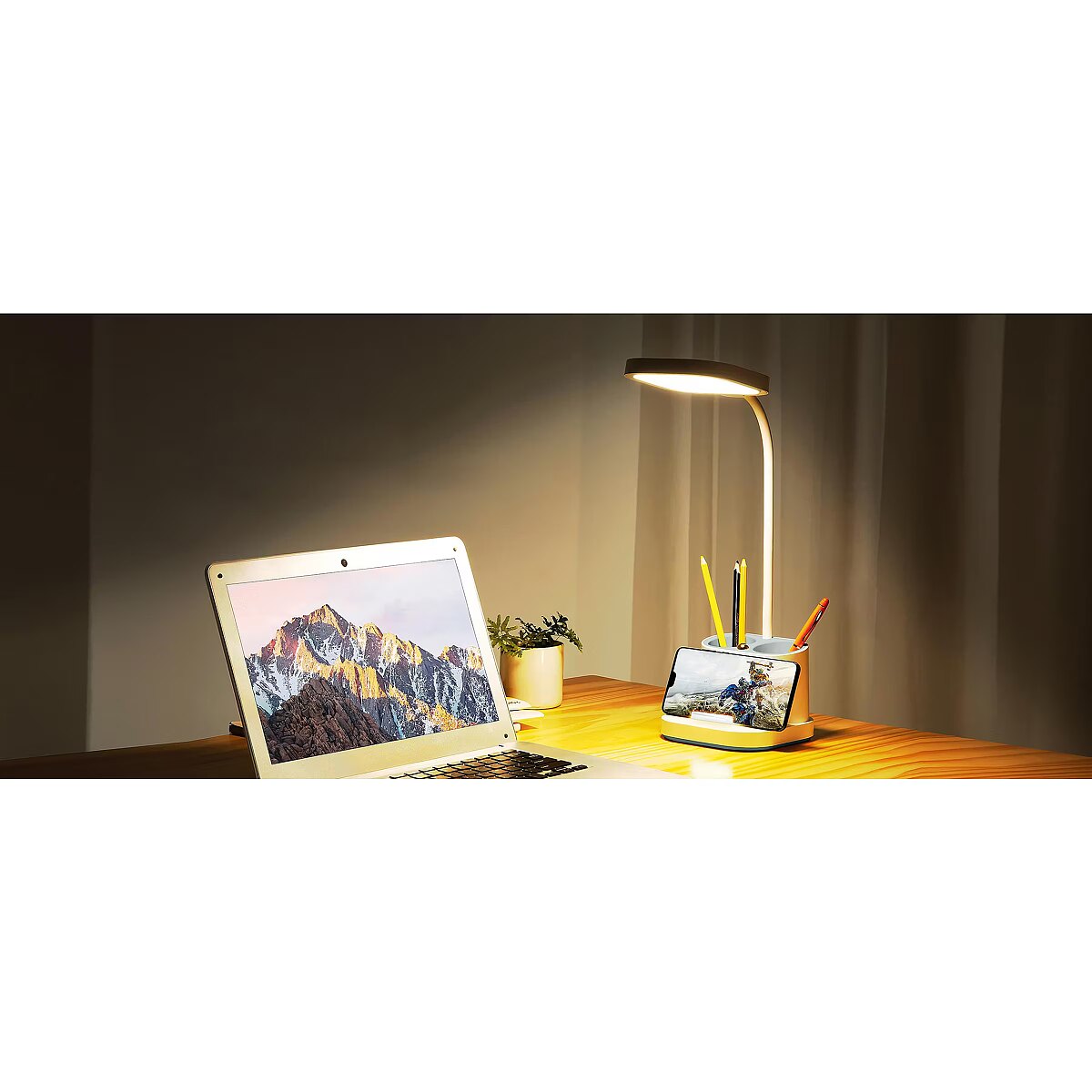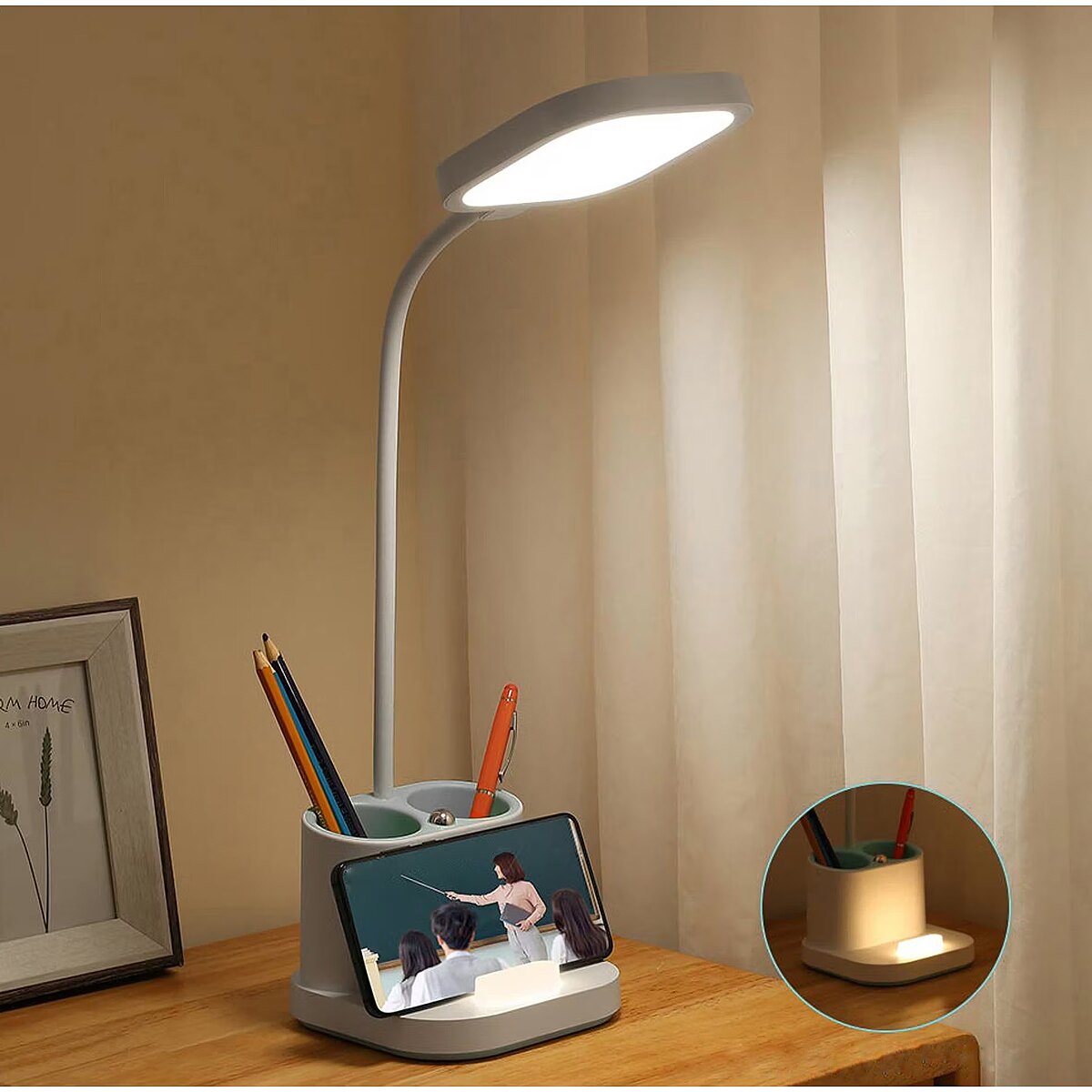description_short_et - Multifunktsionaalne laualamp töölauale või öökapile Energiasäästlik 5 W LED lamp Kasutatav telefonihoidiku ja akupangana Pliiatsitopsi ja öölambi funktsioon Modernne disain