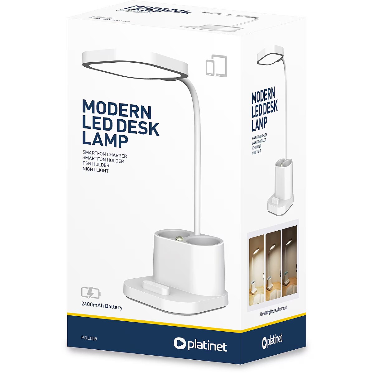 description_en - The Platinet lamp has a three-stage light adjustment, which enables gentle background lighting and workplace lighting. In addition, it can be used as a night or decorative lamp. The lamp is dimmable and the intensity and direction of the light can be adjusted. Thanks to LED technology, the lamp is very energy-efficient and does not get hot. Convenience and practicality are added by the battery bank function, which allows you to charge a smartphone or tablet via the microUSB socket, while keeping it in the holder on the lamp. Luminous flux: 200 lm Operating temperature: 0–40° C 42 LED lamps CRI: 80 Ra IP protection class: IP20 Battery: 2400 mAh Charging time: 5 h Usage time: 6 h Adjusting the brightness of the light Tilt angle adjustment MicroUSB cable 0.9 m included