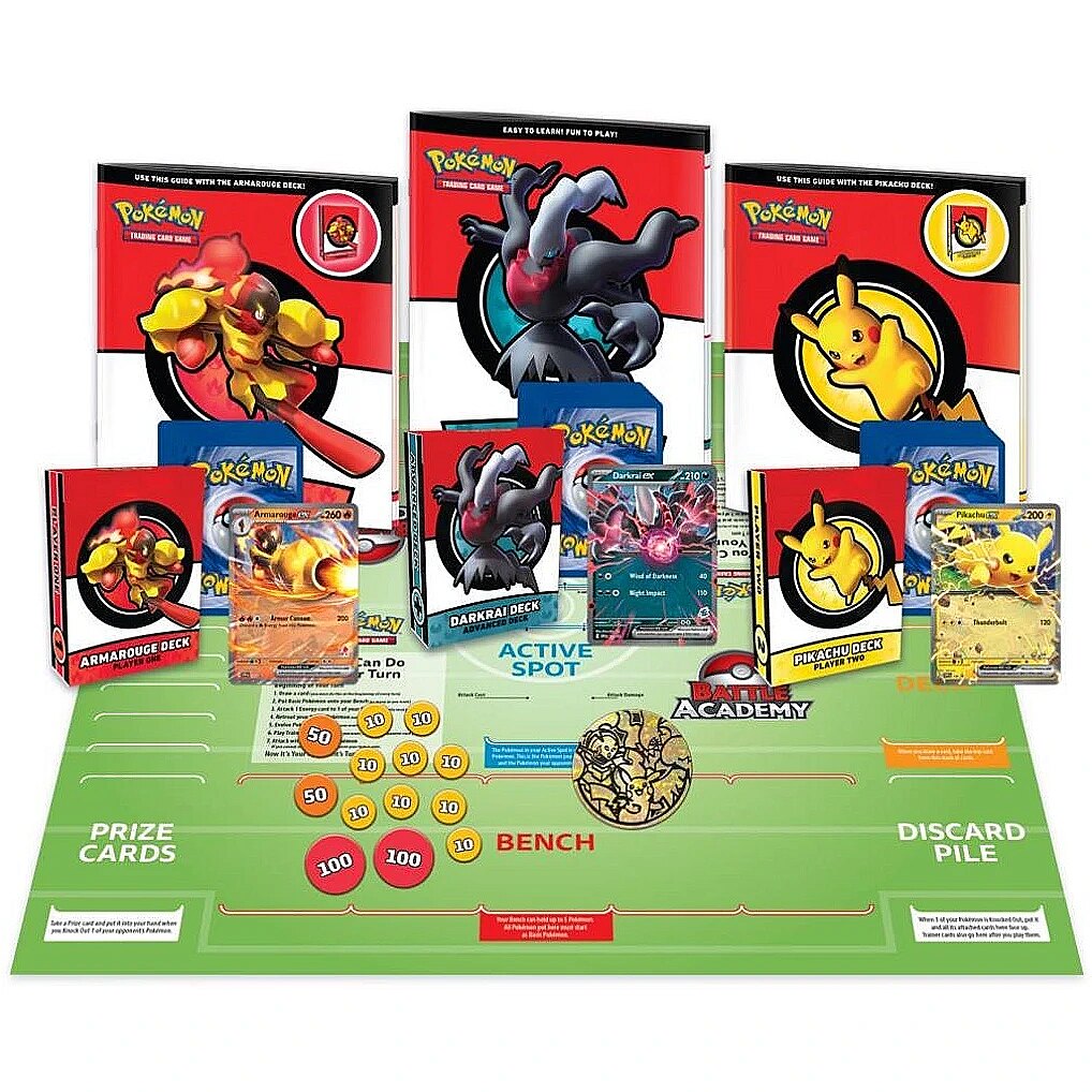 Accessories included - 3 gotowe talie Pokémon TCG: Pikachu, Armarogue, Darkrai (po 60 kart każda) 3 pudełka na talie 2 poradniki startowe jak zacząć rozgrywkę 1 podręcznik z pełnymi zasadami Plansza do gry dla dwóch graczy Metalowa moneta Zestaw znaczników obrażeń Kod do gry Pokémon TCG Online