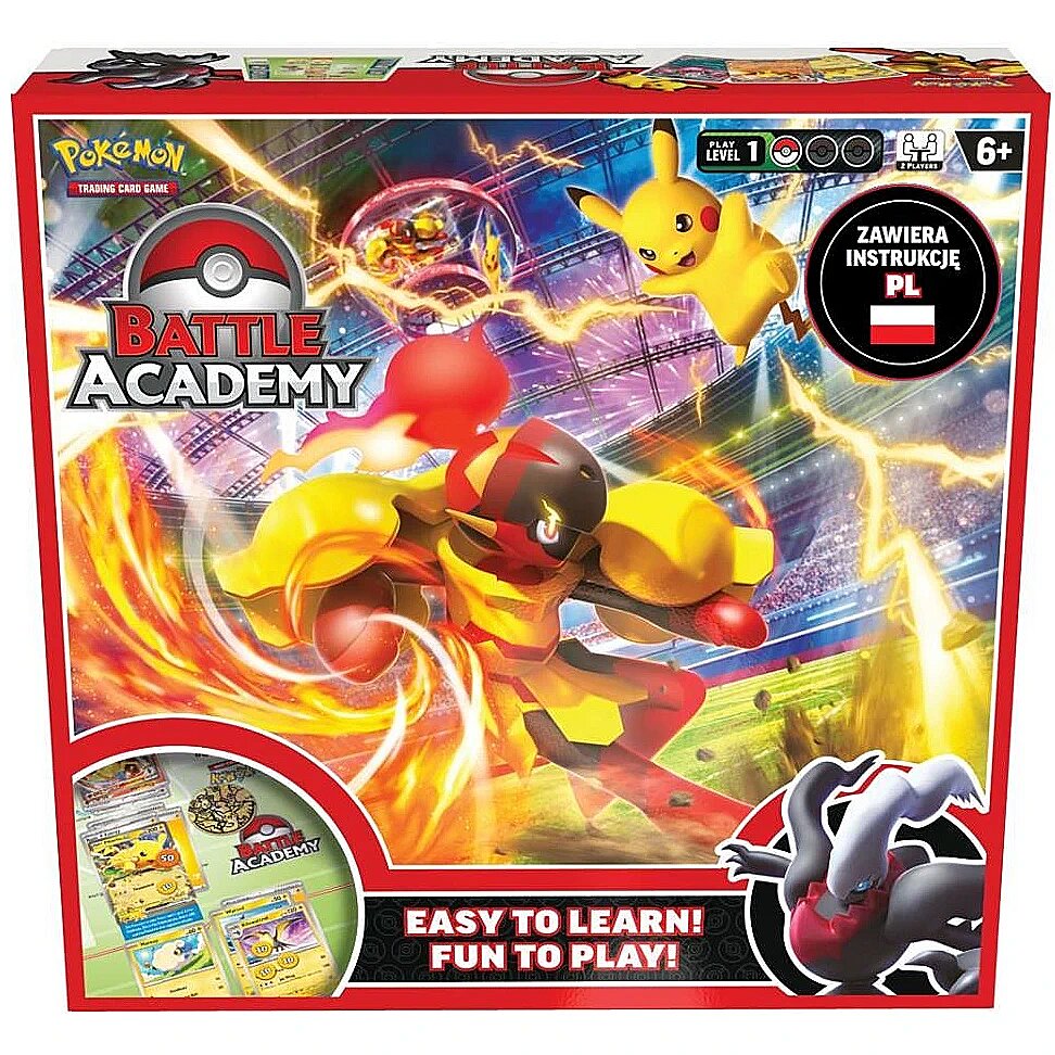Description - Battle Academy to idealny sposób na rozpoczęcie przygody z grą karcianą Pokémon, z oficjalnymi polskimi zasadami, zawartymi w dwóch poradnikach, pomagających zacząć rozgrywkę! Zestaw oferuje trzy gotowe do gry talie, zawierające po 60 kart każda, spakowane w kartonowe pudełka. Każda z nich zawiera potężnego Pokemona ex i oferuje odmienne strategie rozgrywki. Pikachu Ex to elektryczny Pokémon, którego potężny atak potrafi co turę zadawać bolesne obrażenia, a dzięki niskiemu kosztowi wycofania się może opuścić pole walki w dogodnym dla nas momencie, co pozbawi przeciwnika dwóch kart nagrody za jego pokonanie. Darkrai ex jest Pokémonem typu mrocznego, posiada dwa ataki, a jednym z nich może zadawać obrażenia już od drugiej tury. Armarouge ex jest ewolucją Charcadet'a o bardzo wysokiej liczbie punktów wytrzymałości i absurdalnie mocnym atakiem, który jednak kosztuje odrzucenie jednej karty energii. Z uwagi na ewolucję nie wprowadzimy go na pole walki natychmiast, ale przy dobrym planowaniu potrafi przechylić szalę zwycięstwa na naszą korzyść. Pojedynek na arenie przy użyciu tych talii jest dynamiczny i ekscytujący, a z każdą potyczką zdobywamy nowe doświadczenie. Dzięki polskim zasadom rozgrywki możemy nauczyć się sekwencji tur i poprowadzić rozgrywkę z osobami nieznającymi języka angielskiego, a gdy dojdziemy do wprawy, możemy zmienić talię i spróbować swoich sił w innej konfiguracji. Po kilku rozgrywkach możemy zacząć ulepszać swoją ulubioną talię o nowe karty, które zdobędziemy kupując inne produkty marki Pokémon TCG albo wymieniając się z innymi graczami. W grze Pokémon TCG ważne jest zarówno zbieranie kart, opracowanie skutecznej taktyki, jak i odpowiednie wykorzystanie swoich zdolności. Dzięki Battle Academy możesz wcielić się w rolę trenera Pokémonów i przekuć zdobytą wiedzę w zwycięstwo. Czy jesteś gotowy na kolejny pojedynek?
