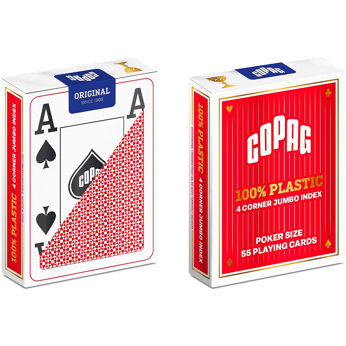 LongSummaryDescription - Copag Jumbo Face - 4 Index - TBX Red. Number of cards: 55 pc(s), Product colour: Red, Material: Plastic. Master (outer) case gross weight: 10.3 kg, Master (outer) case length: 224 mm, Master (outer) case width: 309 mm. Weight: 140 g, Width: 65 mm, Depth: 20 mm