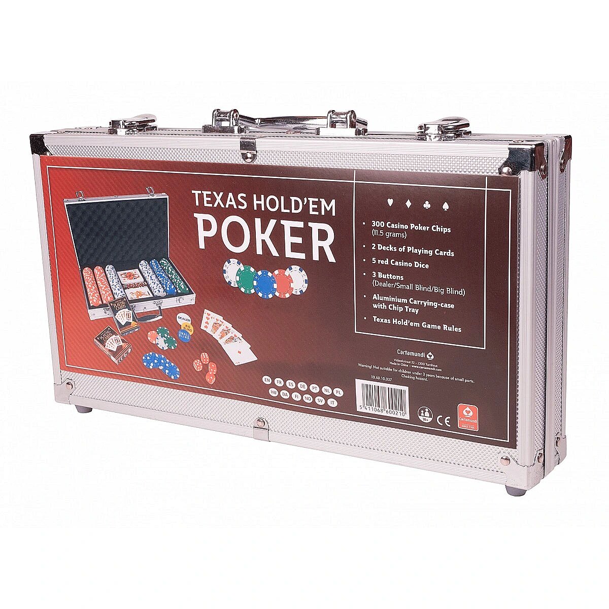 Accessories included - 300 casino poker chips 2x decks of playing cards 3x buttons Aluminium carrying-case with chip tray Texas Holdem game rules