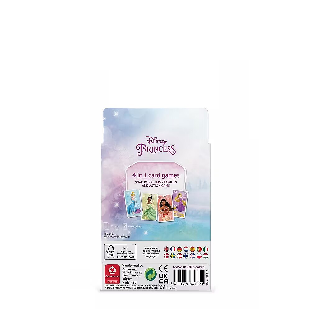 LongSummaryDescription - Shuffle Disney Princess 4-in-1 - 5th panel. Product type: Card Game, Genre: Family, Recommended age (min): 4 yr(s), Playing time: 10 min, Family game