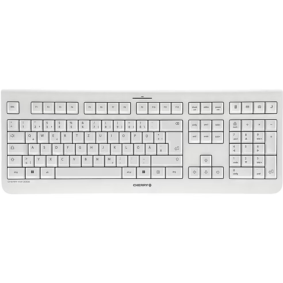 LongSummaryDescription - CHERRY KW 3000. Keyboard form factor: Full-size (100%), Connectivity technology: Wireless, Device interface: RF Wireless, Keyboard layout: QWERTZ, Keyboard number of keys: 109. Wrist rest. Recommended usage: Universal. Product colour: White