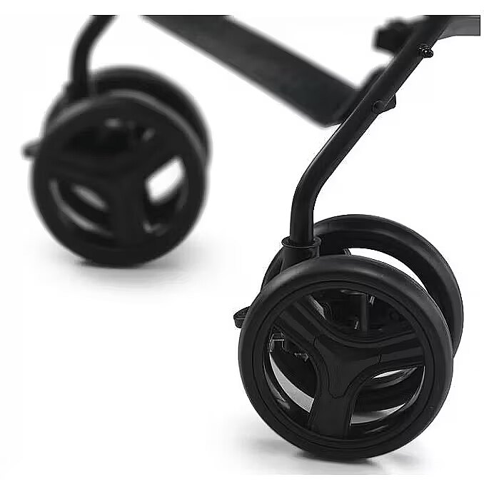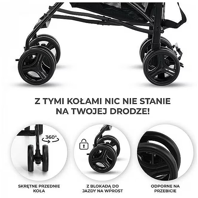 The stroller's wheels are light and puncture-proof, and most importantly: you don't have to inflate them. They will cope well with uneven surfaces, especially when you lock the front wheels to drive straight. Safe