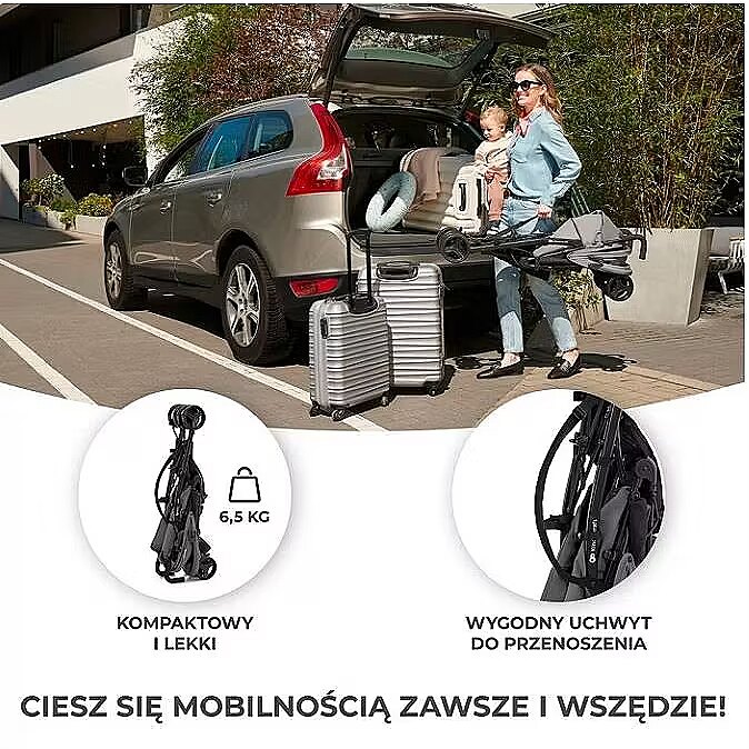 TIK is a lightweight umbrella stroller that can be folded in a few seconds. It weighs only 6.5 kg, which makes it an ideal travel companion, e.g. for longer holidays. The TIK stroller can be easily used at the airport, on a train or on public transport. To make carrying it easier, the stroller is equipped with a comfortable handle. The stroller has a gradual adjustment of the backrest up to a lying position and an adjustable footrest. You don't have to inflate the light, puncture-proof wheels, and if necessary, you can block the two front ones for driving on more difficult terrain, e.g. on an uneven road. They have shock absorption, perfect for uneven paving slabs. The enlargeable canopy will protect your little one from the sun, wind and rain, and the spacious basket will accommodate all the shopping needed during a walk. For holidays and every day TIK is an umbrella stroller, designed for trips and everyday walks. It is a very light stroller: it weighs only 6.5 kg and folds extremely easily. It has a convenient carrying handle, which makes it easier to carry it up the stairs, for example. Lying position